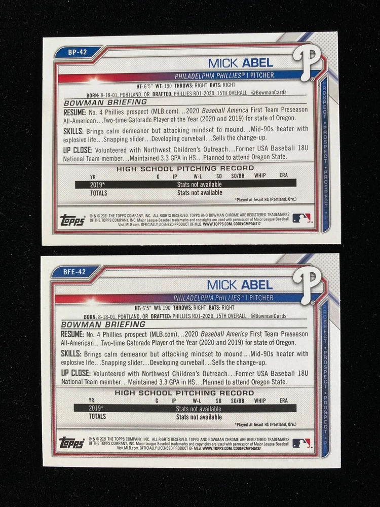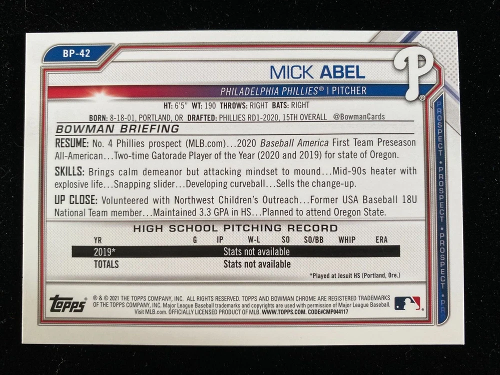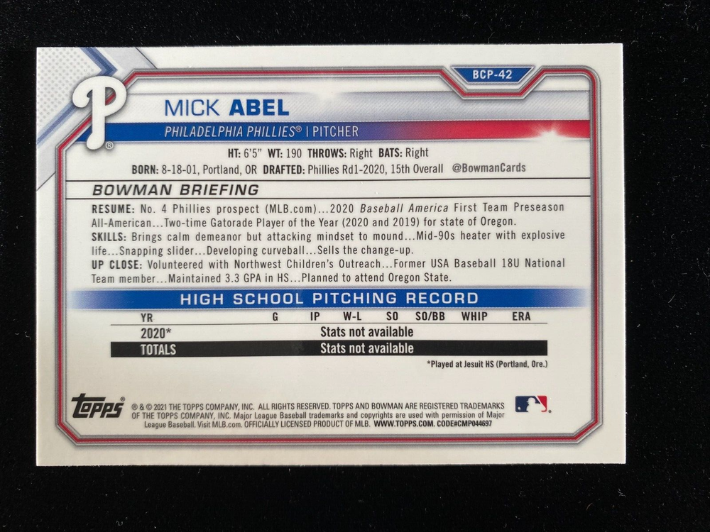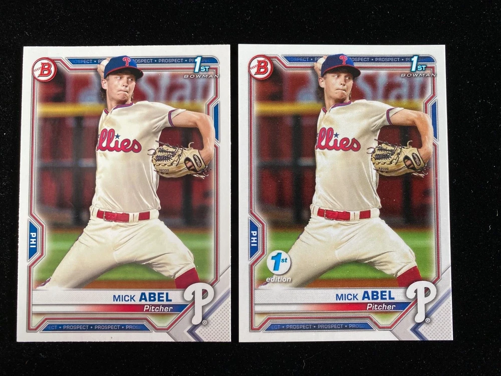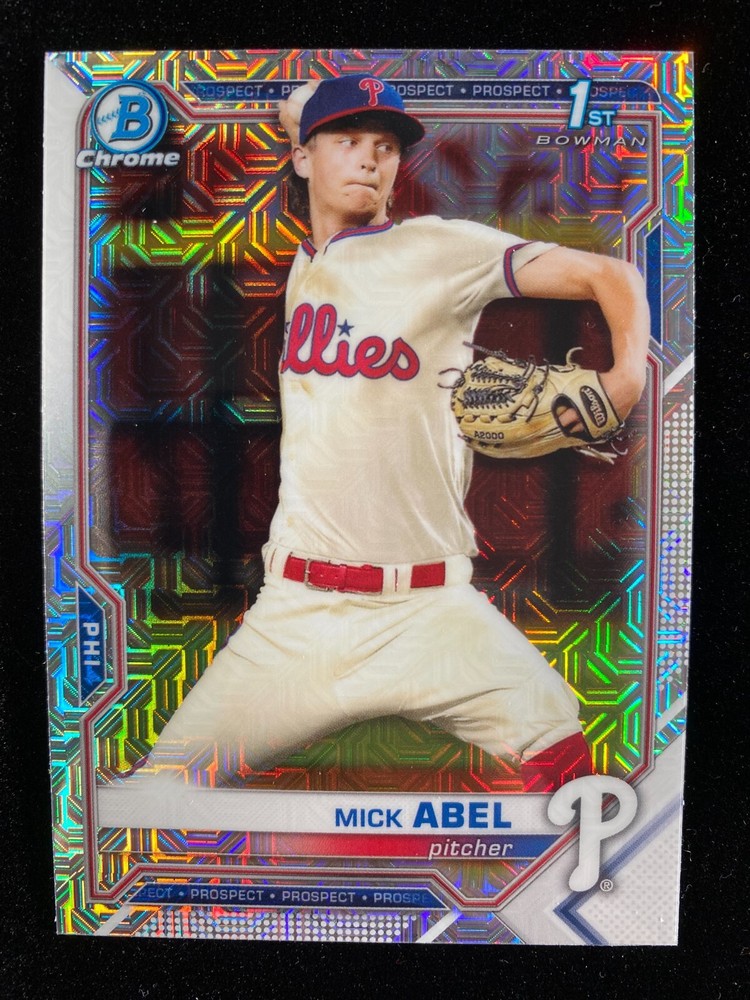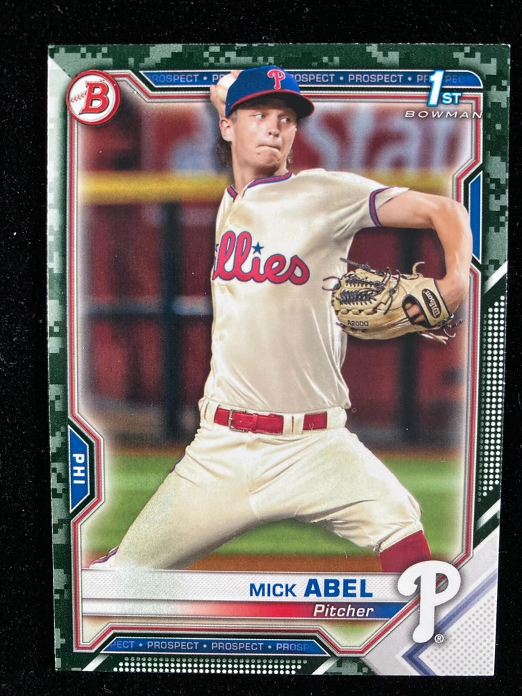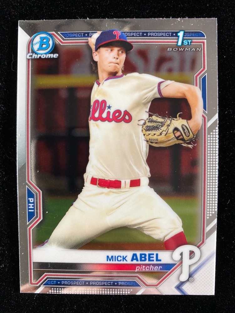 2021 Bowman Chrome MICK ABEL 1st Rookie MEGA BOX MOJO REFRACTOR #BCP-41 Phillies (5) Card RC Lot (1) MEGA BOX MOJO REFRACTOR #BCP-41 (1) Base Chrome #BCP-41 (1) CAMO Parallel #BP-41 (1) Base 1st Edition Paper #BFE-41 (1) Base Paper #BP-41 All cards are at least NRMT unless noted. Some raw cards I list are potential GEM Mint Cards, but please note that all raw ungraded cards may contain pixelated dimples, scratches, printer lines, indents, edge chipping or corner whitening, along with other common condition issues. The card/s pictured in each listing is the card/s received, if you have condition questions please ask. If you're looking for guaranteed GEM MINT 10 cards then I suggest buying cards that are already graded. I will not accept returns under any circumstances, buying sports cards is similar to buying stocks and you cannot return stocks, so please do not try and return the card to me. Most are pulled by me directly from packs and immediately put into sleeves, I do not inspect every card for every potential flaw, so card/s could have no flaws. Card ships USPS, if the card sells for under $20 it will be shipped in PWE, if the card sells for more than $20 it will ship GROUND ADVANTAGE, regardless of S&H cost, I don't know how much the card is going to sell for before it's sold, so I'm just guessing. If auction ends for less than $20 and you would like me to ship in a bubble mailer, please let me know before paying for the auction and I will send an updated invoice. If Auction sells for more than $20 with a low S&H charge I will cover additional cost to ship. Combined shipping is available, at roughly one dollar per additional Listing, with a cap around $10 depending on weight.