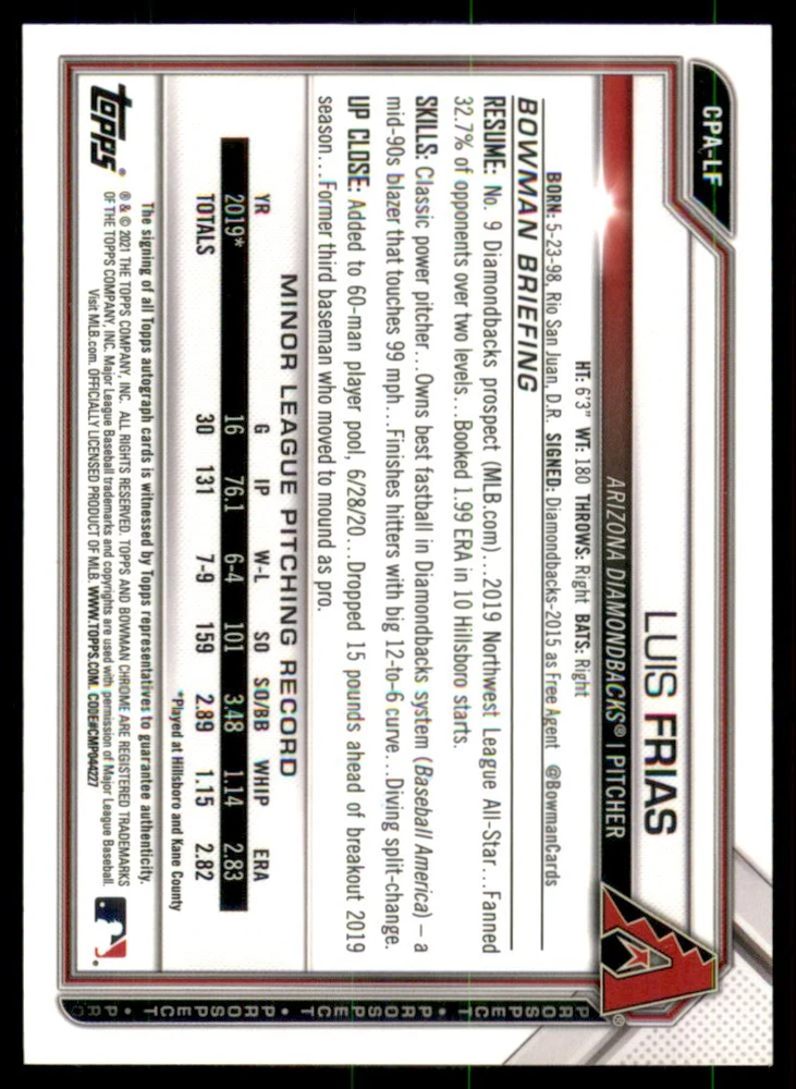 2021 Bowman Chrome Prospect Autographs Diamondbacks #CPALF Luis Frias Front Back Sport: Baseball Set: 2021 Bowman Chrome Prospect Autographs Year: 2021 Item#: CPALF Player: Luis Frias Team: Arizona Diamondbacks Attributes: Autograph Brand: Bowman Chrome Manufacturer: Topps Co. Grading Company: Raw Grade SetType: Insert Item Condition: Near Mint/Mint 2014 Beckett Collectibles, LLC. All Rights Reserved Powered by: Thank you for choosing Burbank Sportscards, the sports cards superstore. We offer a large selection of singles across all sports. Visit our ebay store to view all our items available. Our Shipping Policy We offer Free Standard Shipping to all Domestic customers. Options for Expedited shipping are also available at checkout. For our international customers, shipping is $9.99 for the first item, and $0.25 for each additional item. Note to all customers: To qualify for combines shipping, we ask our customers to add items into the shopping cart. Please note, we do not combine orders that are placed separately. Our Service: Generally, our turnaround is super quick as we process and send out orders same day payment is received. Stock Availability: We do our best to ensure all items are in stock; however, in case of the rare stock out, the customer will have the option for a replacement card, or we will process a refund so the order is not held up. Our Images: Many of our images are stock photos from Beckett archives. They are a representation of the actual card you would receive. If you have any questions regarding the item you're interested in, please feel free to ask (serial numbers and relic pieces may vary) Moreover, in a case of a wrong or defective photo, please notify us, so we can adjust it. Other FAQ's: -When buying multiple cards, do you top load each item? No; however, we do try to insure all items are shipped securely. If you wish to have all of your cards top loaded it is a paid service and can be arranged. Please email for more details. For other questions, please feel free to ask. Thank you.