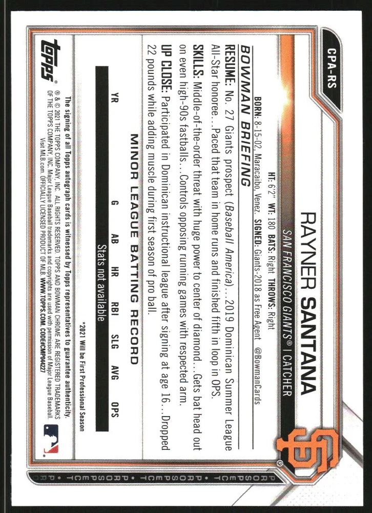 2021 Bowman Chrome Prospect Autographs Green Refractors #CPARS Rayner Santana/99 Front Back Sport: Baseball Set: 2021 Bowman Chrome Prospect Autographs Green Refractors Year: 2021 Item#: CPARS Player: Rayner Santana Team: San Francisco Giants Attributes: Autograph, Serial Numbered Brand: Bowman Chrome Manufacturer: Topps Co. Grading Company: Raw Grade SetType: Parallel Insert Item Condition: Near Mint/Mint 2014 Beckett Collectibles, LLC. All Rights Reserved Powered by: Thank you for choosing Burbank Sportscards, the sports cards superstore. We offer a large selection of singles across all sports. Visit our ebay store to view all our items available. Our Shipping Policy We offer Free Standard Shipping to all Domestic customers. Options for Expedited shipping are also available at checkout. For our international customers, shipping is $9.99 for the first item, and $0.25 for each additional item. Note to all customers: To qualify for combines shipping, we ask our customers to add items into the shopping cart. Please note, we do not combine orders that are placed separately. Our Service: Generally, our turnaround is super quick as we process and send out orders same day payment is received. Stock Availability: We do our best to ensure all items are in stock; however, in case of the rare stock out, the customer will have the option for a replacement card, or we will process a refund so the order is not held up. Our Images: Many of our images are stock photos from Beckett archives. They are a representation of the actual card you would receive. If you have any questions regarding the item you're interested in, please feel free to ask (serial numbers and relic pieces may vary) Moreover, in a case of a wrong or defective photo, please notify us, so we can adjust it. Other FAQ's: -When buying multiple cards, do you top load each item? No; however, we do try to insure all items are shipped securely. If you wish to have all of your cards top loaded it is a paid service and can be arranged. Please email for more details. For other questions, please feel free to ask. Thank you.