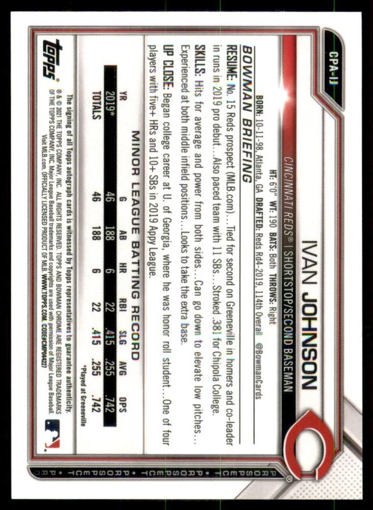 2021 Bowman Chrome Prospect Autographs Purple Ref #CPADK D'Shawn Knowles /250 Front Back Sport: Baseball Set: 2021 Bowman Chrome Prospect Autographs Purple Refractors Year: 2021 Item#: CPADK Player: D'Shawn Knowles Team: Los Angeles Angels Attributes: Autograph, Serial Numbered Brand: Bowman Chrome Manufacturer: Topps Co. Grading Company: Raw Grade SetType: Parallel Insert Item Condition: Near Mint/Mint 2014 Beckett Collectibles, LLC. All Rights Reserved Powered by: Thank you for choosing Burbank Sportscards, the sports cards superstore. We offer a large selection of singles across all sports. Visit our ebay store to view all our items available. Our Shipping Policy We offer Free Standard Shipping to all Domestic customers. Options for Expedited shipping are also available at checkout. For our international customers, shipping is $9.99 for the first item, and $0.25 for each additional item. Note to all customers: To qualify for combines shipping, we ask our customers to add items into the shopping cart. Please note, we do not combine orders that are placed separately. Our Service: Generally, our turnaround is super quick as we process and send out orders same day payment is received. Stock Availability: We do our best to ensure all items are in stock; however, in case of the rare stock out, the customer will have the option for a replacement card, or we will process a refund so the order is not held up. Our Images: Many of our images are stock photos from Beckett archives. They are a representation of the actual card you would receive. If you have any questions regarding the item you're interested in, please feel free to ask (serial numbers and relic pieces may vary) Moreover, in a case of a wrong or defective photo, please notify us, so we can adjust it. Other FAQ's: -When buying multiple cards, do you top load each item? No; however, we do try to insure all items are shipped securely. If you wish to have all of your cards top loaded it is a paid service and can be arranged. Please email for more details. For other questions, please feel free to ask. Thank you.