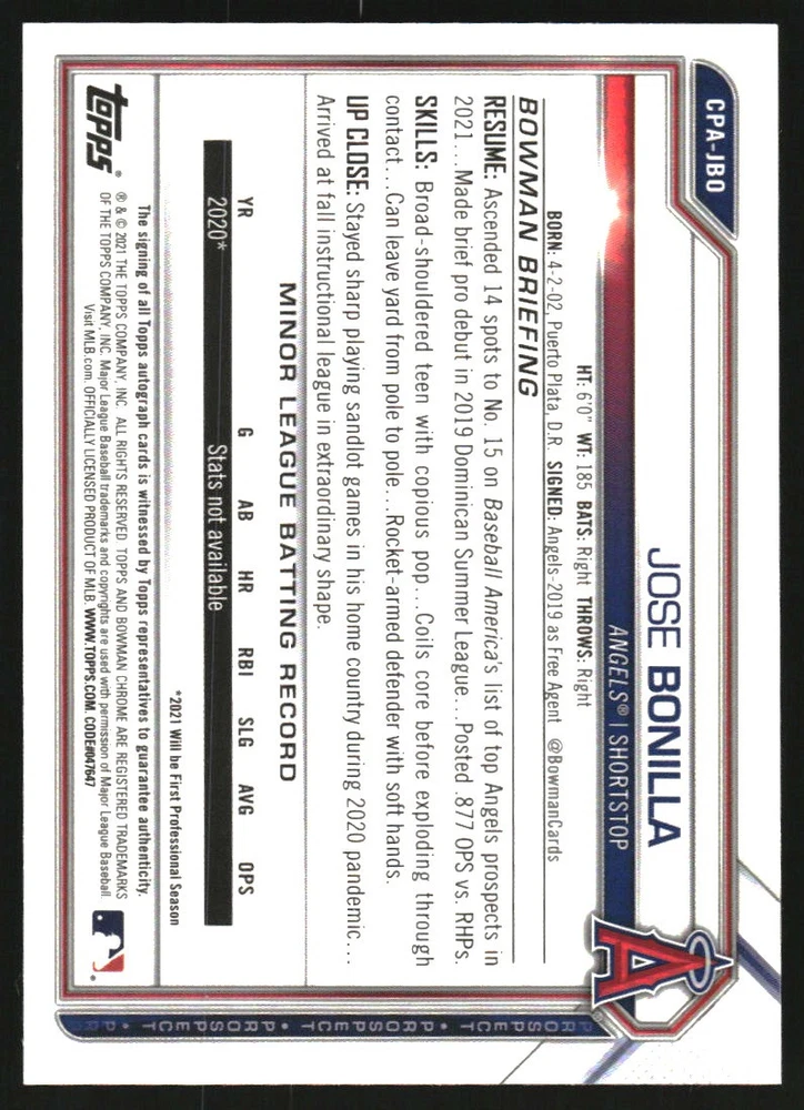 2021 Bowman Chrome Prospect Autographs Purple Ref #CPAJBO Jose Bonilla /250 Front Back Sport: Baseball Set: 2021 Bowman Chrome Prospect Autographs Purple Refractors Year: 2021 Item#: CPAJBO Player: Jose Bonilla Team: Los Angeles Angels Attributes: Autograph, Serial Numbered Brand: Bowman Chrome Manufacturer: Topps Co. Grading Company: Raw Grade SetType: Parallel Insert Item Condition: Near Mint/Mint 2014 Beckett Collectibles, LLC. All Rights Reserved Powered by: Thank you for choosing Burbank Sportscards, the sports cards superstore. We offer a large selection of singles across all sports. Visit our ebay store to view all our items available. Our Shipping Policy We offer Free Standard Shipping to all Domestic customers. Options for Expedited shipping are also available at checkout. For our international customers, shipping is $9.99 for the first item, and $0.25 for each additional item. Note to all customers: To qualify for combines shipping, we ask our customers to add items into the shopping cart. Please note, we do not combine orders that are placed separately. Our Service: Generally, our turnaround is super quick as we process and send out orders same day payment is received. Stock Availability: We do our best to ensure all items are in stock; however, in case of the rare stock out, the customer will have the option for a replacement card, or we will process a refund so the order is not held up. Our Images: Many of our images are stock photos from Beckett archives. They are a representation of the actual card you would receive. If you have any questions regarding the item you're interested in, please feel free to ask (serial numbers and relic pieces may vary) Moreover, in a case of a wrong or defective photo, please notify us, so we can adjust it. Other FAQ's: -When buying multiple cards, do you top load each item? No; however, we do try to insure all items are shipped securely. If you wish to have all of your cards top loaded it is a paid service and can be arranged. Please email for more details. For other questions, please feel free to ask. Thank you.
