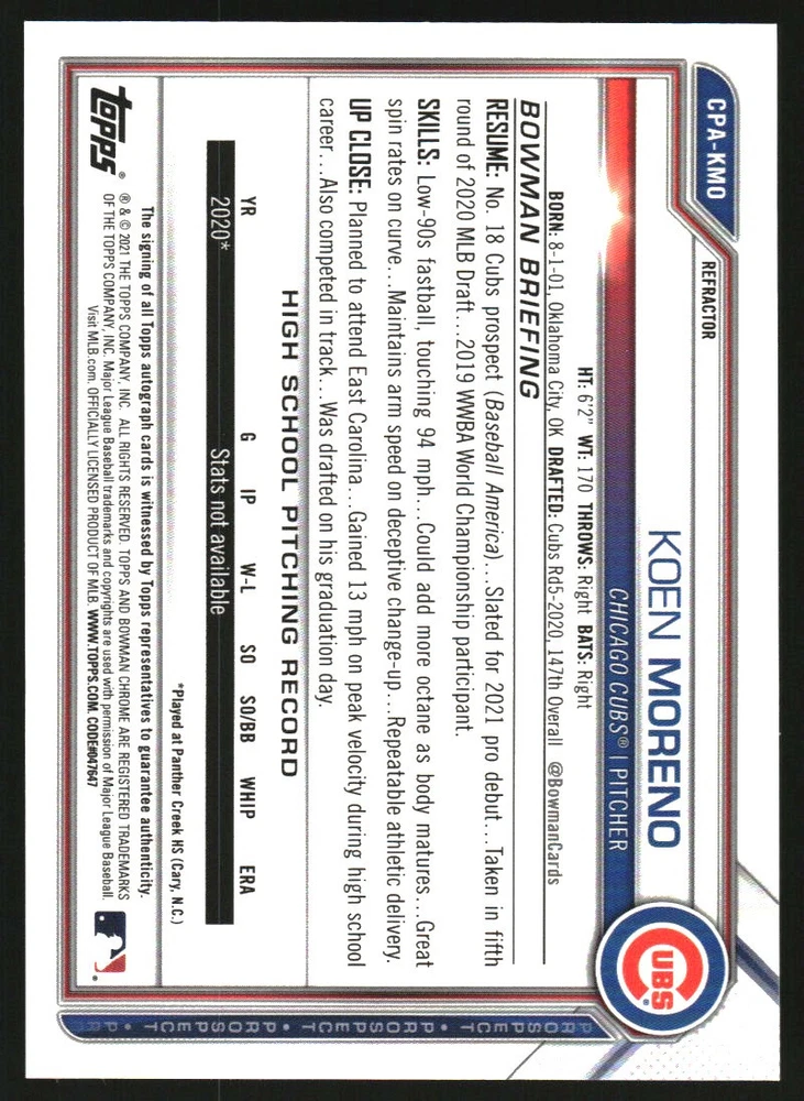 2021 Bowman Chrome Prospect Autographs Refractors #CPAKMO Koen Moreno /499 Front Back Sport: Baseball Set: 2021 Bowman Chrome Prospect Autographs Refractors Year: 2021 Item#: CPAKMO Player: Koen Moreno Team: Chicago Cubs Attributes: Autograph, Serial Numbered Brand: Bowman Chrome Manufacturer: Topps Co. Grading Company: Raw Grade SetType: Parallel Insert Item Condition: Near Mint/Mint 2014 Beckett Collectibles, LLC. All Rights Reserved Powered by: Thank you for choosing Burbank Sportscards, the sports cards superstore. We offer a large selection of singles across all sports. Visit our ebay store to view all our items available. Our Shipping Policy We offer Free Standard Shipping to all Domestic customers. Options for Expedited shipping are also available at checkout. For our international customers, shipping is $9.99 for the first item, and $0.25 for each additional item. Note to all customers: To qualify for combines shipping, we ask our customers to add items into the shopping cart. Please note, we do not combine orders that are placed separately. Our Service: Generally, our turnaround is super quick as we process and send out orders same day payment is received. Stock Availability: We do our best to ensure all items are in stock; however, in case of the rare stock out, the customer will have the option for a replacement card, or we will process a refund so the order is not held up. Our Images: Many of our images are stock photos from Beckett archives. They are a representation of the actual card you would receive. If you have any questions regarding the item you're interested in, please feel free to ask (serial numbers and relic pieces may vary) Moreover, in a case of a wrong or defective photo, please notify us, so we can adjust it. Other FAQ's: -When buying multiple cards, do you top load each item? No; however, we do try to insure all items are shipped securely. If you wish to have all of your cards top loaded it is a paid service and can be arranged. Please email for more details. For other questions, please feel free to ask. Thank you.