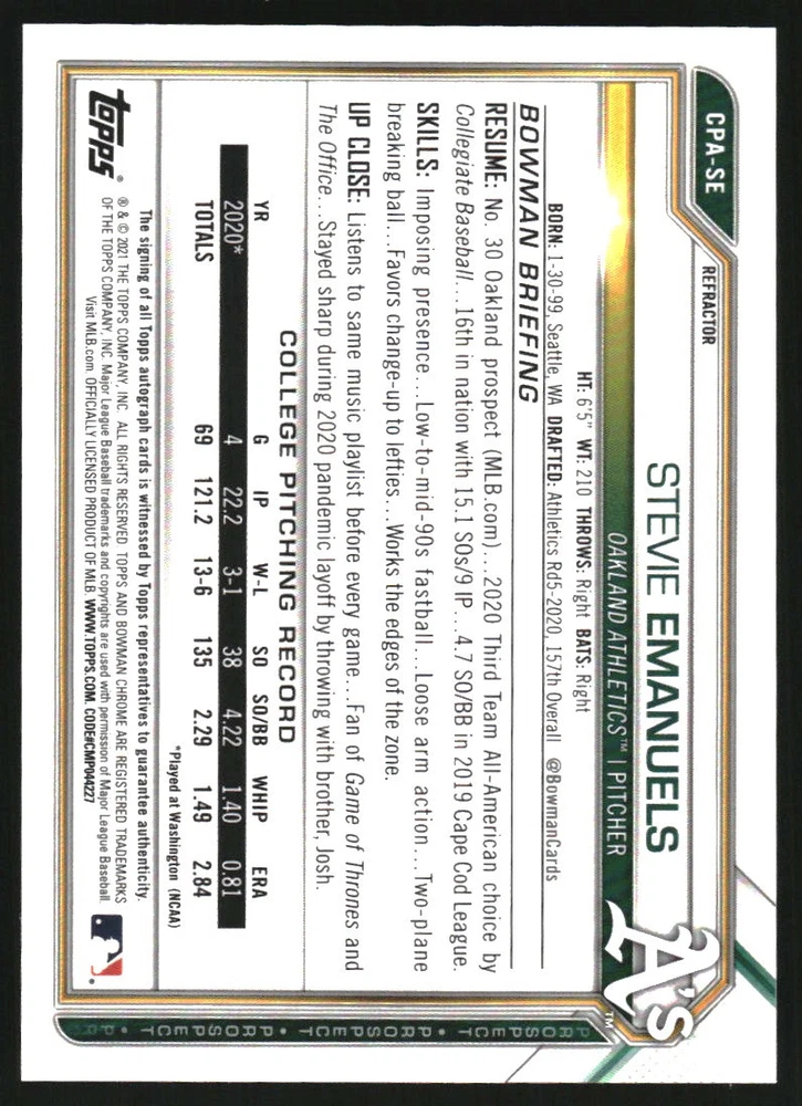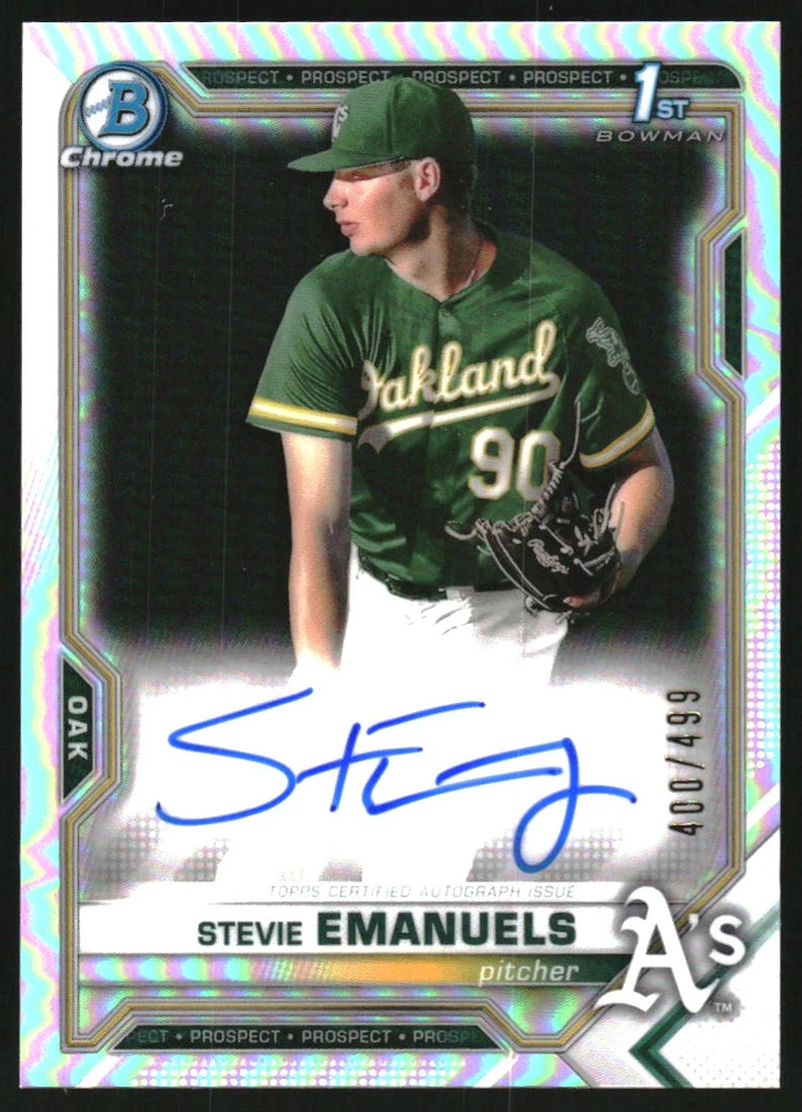 2021 Bowman Chrome Prospect Autographs Refractors #CPASE Stevie Emanuels /499 Front Back Sport: Baseball Set: 2021 Bowman Chrome Prospect Autographs Refractors Year: 2021 Item#: CPASE Player: Stevie Emanuels Team: Oakland Athletics Attributes: Autograph, Serial Numbered Brand: Bowman Chrome Manufacturer: Topps Co. Grading Company: Raw Grade SetType: Parallel Insert Item Condition: Near Mint/Mint 2014 Beckett Collectibles, LLC. All Rights Reserved Powered by: Thank you for choosing Burbank Sportscards, the sports cards superstore. We offer a large selection of singles across all sports. Visit our ebay store to view all our items available. Our Shipping Policy We offer Free Standard Shipping to all Domestic customers. Options for Expedited shipping are also available at checkout. For our international customers, shipping is $9.99 for the first item, and $0.25 for each additional item. Note to all customers: To qualify for combines shipping, we ask our customers to add items into the shopping cart. Please note, we do not combine orders that are placed separately. Our Service: Generally, our turnaround is super quick as we process and send out orders same day payment is received. Stock Availability: We do our best to ensure all items are in stock; however, in case of the rare stock out, the customer will have the option for a replacement card, or we will process a refund so the order is not held up. Our Images: Many of our images are stock photos from Beckett archives. They are a representation of the actual card you would receive. If you have any questions regarding the item you're interested in, please feel free to ask (serial numbers and relic pieces may vary) Moreover, in a case of a wrong or defective photo, please notify us, so we can adjust it. Other FAQ's: -When buying multiple cards, do you top load each item? No; however, we do try to insure all items are shipped securely. If you wish to have all of your cards top loaded it is a paid service and can be arranged. Please email for more details. For other questions, please feel free to ask. Thank you.
