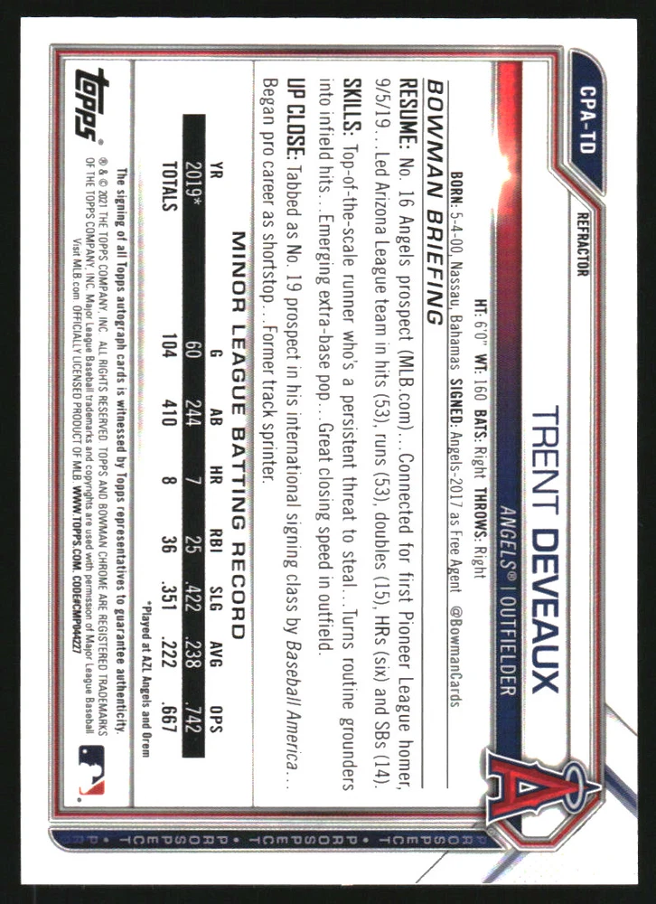 2021 Bowman Chrome Prospect Autographs Refractors #CPATD Trent Deveaux/499 Front Back Sport: Baseball Set: 2021 Bowman Chrome Prospect Autographs Refractors Year: 2021 Item#: CPATD Player: Trent Deveaux Team: Los Angeles Angels Attributes: Autograph, Serial Numbered Brand: Bowman Chrome Manufacturer: Topps Co. Grading Company: Raw Grade SetType: Parallel Insert Item Condition: Near Mint/Mint 2014 Beckett Collectibles, LLC. All Rights Reserved Powered by: Thank you for choosing Burbank Sportscards, the sports cards superstore. We offer a large selection of singles across all sports. Visit our ebay store to view all our items available. Our Shipping Policy We offer Free Standard Shipping to all Domestic customers. Options for Expedited shipping are also available at checkout. For our international customers, shipping is $9.99 for the first item, and $0.25 for each additional item. Note to all customers: To qualify for combines shipping, we ask our customers to add items into the shopping cart. Please note, we do not combine orders that are placed separately. Our Service: Generally, our turnaround is super quick as we process and send out orders same day payment is received. Stock Availability: We do our best to ensure all items are in stock; however, in case of the rare stock out, the customer will have the option for a replacement card, or we will process a refund so the order is not held up. Our Images: Many of our images are stock photos from Beckett archives. They are a representation of the actual card you would receive. If you have any questions regarding the item you're interested in, please feel free to ask (serial numbers and relic pieces may vary) Moreover, in a case of a wrong or defective photo, please notify us, so we can adjust it. Other FAQ's: -When buying multiple cards, do you top load each item? No; however, we do try to insure all items are shipped securely. If you wish to have all of your cards top loaded it is a paid service and can be arranged. Please email for more details. For other questions, please feel free to ask. Thank you.