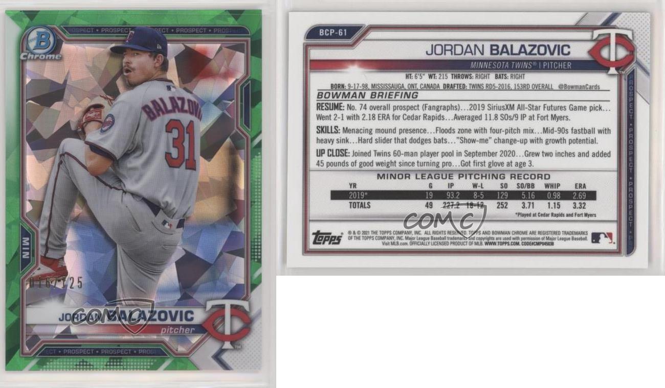 2021 Bowman Sapphire Edition - Chrome Prospects - Green Refractor #BCP-61 Jordan Balazovic Qty Made: 125 - Rookie - Baseball Card - Featuring the Minnesota Twins - Featuring Jordan Balazovic Search for more: 2021 Bowman Sapphire Edition Search for more: 2021 Bowman Sapphire Edition - Chrome Prospects - Green Refractor View all of our Listings Auctions Buy It Now About Us Located in the beautiful Pacific Northwest, COMC (Check Out My Cards) is the world's largest consignment service for trading card singles. More than 10,000 people have used our consignment service to list over 50 million trading cards. Find out how we can help you consign your items on eBay by contacting us through eBay messaging. COMC -- "The Safe & Easy Way to Buy & Sell" Representative Image - Select Specific Item above to see image of actual item Representative Image - Select Specific Item above to see image of actual item Raw Condition for Modern Cards Unless otherwise noted, raw modern cards are listed in Near Mint-Mint condition or better. A NM-MT card appears to be Mint at first glance, but upon closer inspection, may exhibit some of the following: minor print defects (e.g. roller marks, print line, dimple), minor scratches, slight edge wear, and slight corner wear. Centering is clearly visible in the images provided and does not factor into our condition assessment. Raw Condition for Vintage Cards Unless otherwise noted, raw vintage cards are listed in Excellent condition or better. An EX card may exhibit some of the following: minor rounding of corners, surface wear, print defects, light scratches, and slight edge wear/chipping. Centering is clearly visible in the images provided and does not factor into our condition assessment. Domestic Shipping Combined shipping for multiple items is available. To receive combined shipping, please ensure all desired items are in your eBay shopping cart before proceeding to checkout. eBay limits orders to 40 items per order. We automatically combine multiple orders placed on the same day. If you place multiple orders on the same day, please contact us to request a refund of applicable shipping costs. Signature confirmation may be required on invoices over $400. All cards are protected and shipped securely. International Shipping COMC offers eBay's International Shipping (EIS) for international orders under $2,500* (see country exceptions below). All duties and import fees are paid at checkout; in the rare event that there are additional import fees upon delivery, these are borne by the buyer. EIS packages route through a shipping hub in Erlanger, KY before shipping to their final destination. Please note that EIS does not allow for combined shipments. The shipping rates are determined by eBay and cannot be adjusted. *Maximum sale price exceptions: Colombia, Kuwait ($2,000); Taiwan ($1,539); Chile, Costa Rica, Guatemala, Honduras, Trinidad and Tobago ($1,000); Antigua and Barbuda, Aruba, Belize, Dominica, Grenada, Philippines, Saint Kitts and Nevis, Saint Lucia, Montserrat, Turks and Caicos Islands ($500); Dominican Republic, El Salvador ($200). Please request a shipping quote through eBay messaging for orders that exceed the maximum sale price supported by eBay's International Shipping. You will be responsible for all duties and import fees for international orders shipped outside the EIS. All cards are protected and shipped securely. Payment COMC does not accept offers on our cards through our eBay storefront. COMC utilizes eBay’s managed payments system. If you are experiencing difficulties making a payment, please contact eBay for assistance. Return Policy Returns are only accepted on the rare occasion the item is not as described. If you are making a return, please initiate the return process through eBay so a mailing label can be provided for you. Prior to listing, our expert team carefully assessed this item to represent it accurately. Please review the description and high-definition images prior to purchasing to ensure this item meets your satisfaction. We welcome you to contact us if you have further questions about this item. Trust and Integrity COMC carefully assesses each item consigned to us to prevent fraudulent items from entering the marketplace. If you believe an item offered on COMC may be fraudulent, please contact us with details so we can investigate the issue. Items we determine are outside our supported items policy may be removed. Last Modified: 3/13/2025 4:59:20 AM PDT