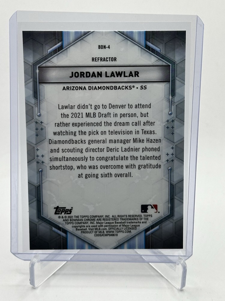 It is a 2021 Bowman Draft Night Refractor trading card featuring Jordan Lawlar of the Arizona Diamondbacks. The card is serial numbered out of 250 and is a rookie card. Produced by Topps, this single-insert card is part of the 2021 Bowman Draft set. The card number is BDN-4.