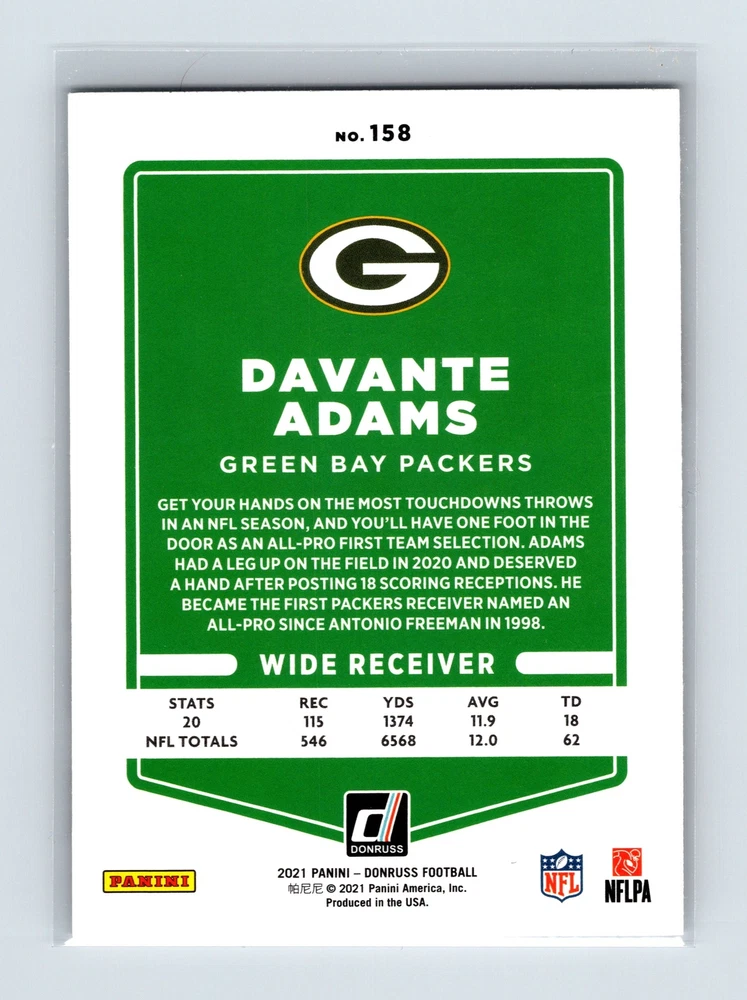 Carolina Cards North Carolina Based Online Sports Card Shop This is a 2021 Donruss Davante Adams No Helmet Green Bay Packers All items will be shipped PWE (Plain White Envelope). This is designed to keep the shipping cost cheap for the buyer. Combined payments will be allowed up to (3) three days in attempt to offer a discount. Please review the card and condition before placing a bid or purchasing the item. Look at our eBay page for more great deals on cards just like this one!
