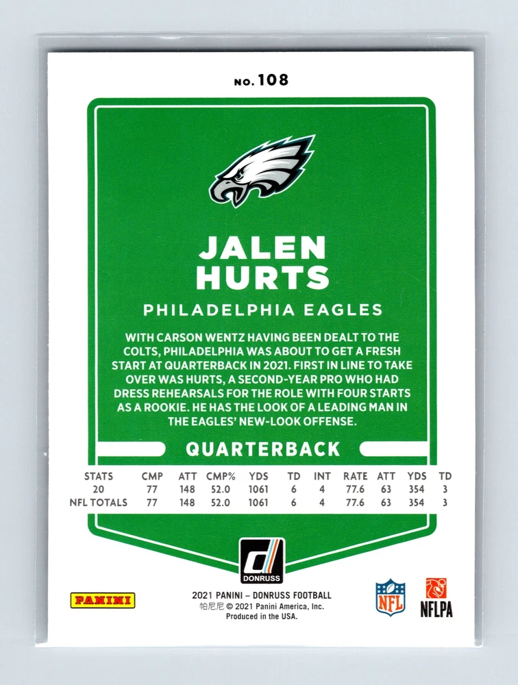 Carolina Cards North Carolina Based Online Sports Card Shop This is a 2021 Donruss Jalen Hurts No Helmet Philadelphia Eagles All items will be shipped PWE (Plain White Envelope). This is designed to keep the shipping cost cheap for the buyer. Combined payments will be allowed up to (3) three days in attempt to offer a discount. Please review the card and condition before placing a bid or purchasing the item. Look at our eBay page for more great deals on cards just like this one!
