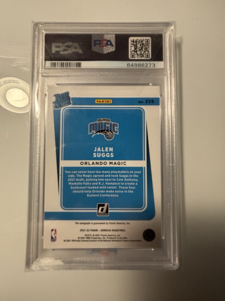 This is a rare and highly sought-after 2021-22 Panini Donruss trading card featuring Jalen Suggs of the Orlando Magic. The card is autographed by Suggs and has a limited print run of 49, with this particular card being numbered 48 out of 49. Graded a perfect 10 by Professional Sports Authenticator (PSA), it is a blue parallel variety with a unique color match. This collectible item is a valuable addition to any basketball card collection, especially considering its low population of only 2 PSA 10 graded copies.