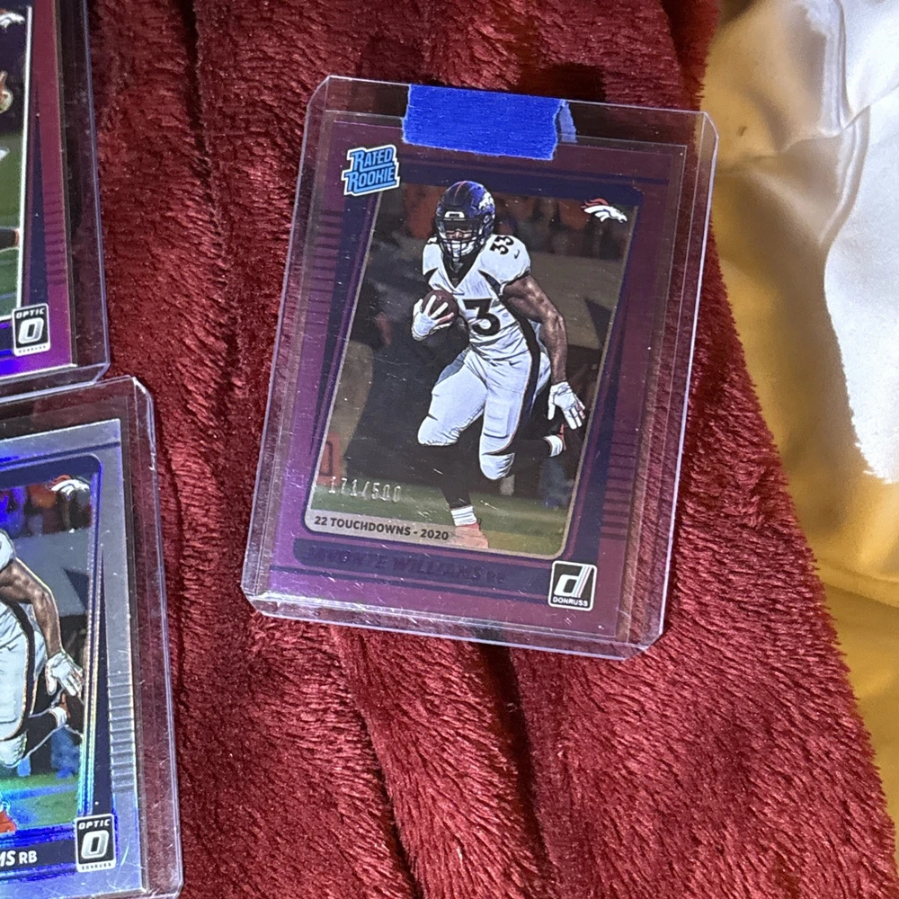 Elevate your collection with this lot of 12 Javonte Williams Rated Rookie cards from the 2021 Donruss Optic/Base set. Each card showcases the Denver Broncos' promising talent in his rookie year, making it a must-have for fans and collectors. Among the lot, one card stands out with a Purple Prizm parallel, limited to just 500 copies, adding a touch of exclusivity to your assortment. Crafted in the United States, these cards feature standard sizing and are printed on high-quality card stock, ensuring durability and a premium feel. They are original prints, not autographed, and come in English language only. Celebrate Williams' NFL journey with this captivating collection from the 2021 season.
