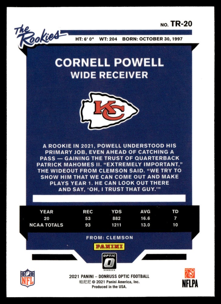 The Card pictured is the card you will receive unless there are multiple quantities then you will receive a card in the comparable grade. Cards in poor condition could have creasing, stains, rounded corners, pen marks or a combo of them. please see pics for a better understanding of cards condition. Excellent Kansas City Chiefs The Rookies Cornell Powell #TR-20 2021 Donruss Optic 2021 Football .