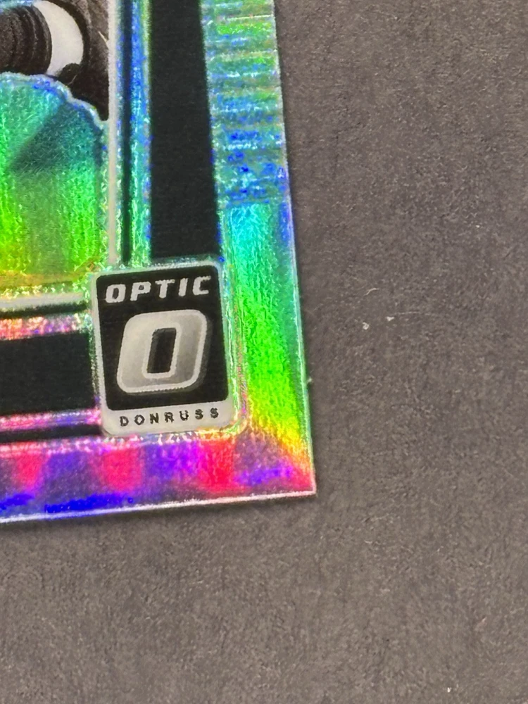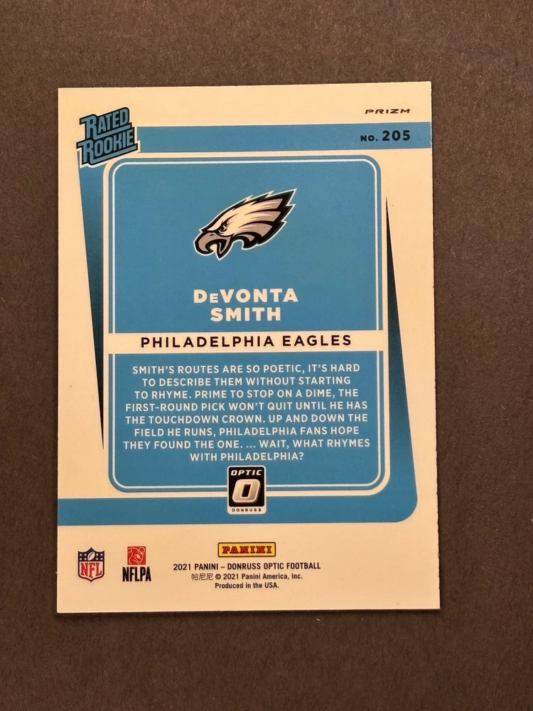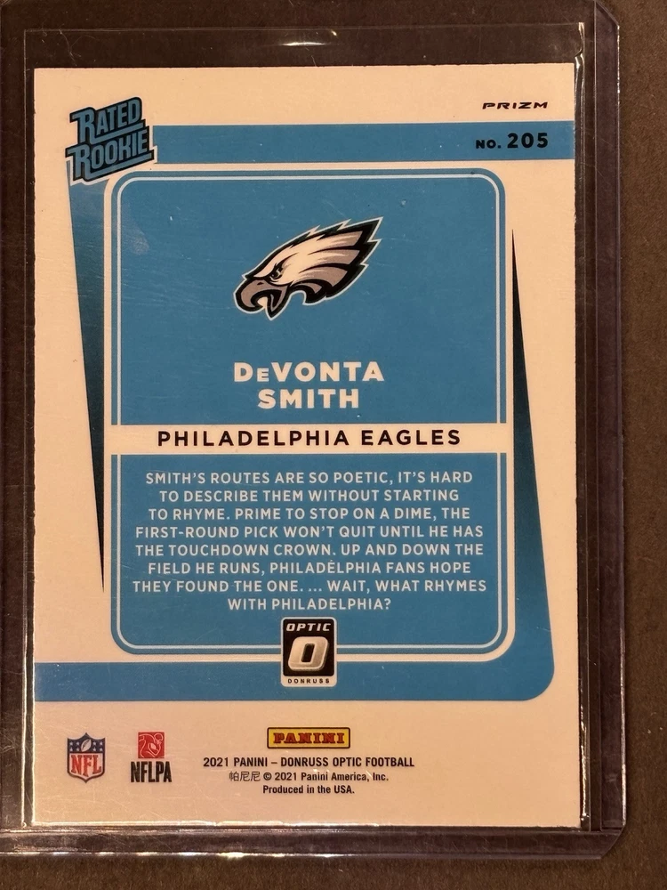 This is a lot of two 2021 Donruss Optic football trading cards featuring DeVonta Smith of the Philadelphia Eagles. The cards are part of the Blue Scope and Halo sets, both made of card stock and not autographed. They are original and licensed by Donruss, with the Blue Scope card showcasing a blue color scheme and the Halo card featuring a unique design. These rookie cards are a collectible item for fans of DeVonta Smith and the NFL.