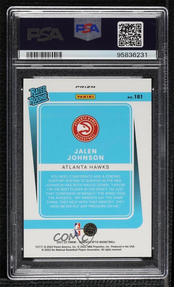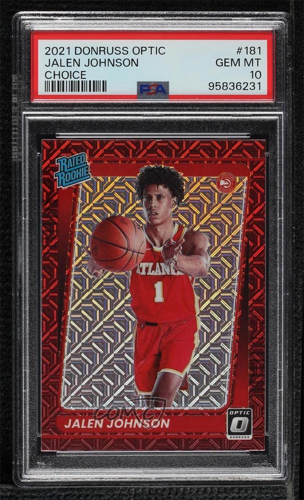 2021-22 Panini Donruss Optic - [Base] - Choice Prizm #181 Rated Rookie - Jalen Johnson Graded PSA 10 GEM MT - RC (Rookie Card) - Basketball Card - Featuring the Atlanta Hawks - Featuring Jalen Johnson Search for more: 2021-22 Panini Donruss Optic Search for more: 2021-22 Panini Donruss Optic - [Base] - Choice Prizm View all of our Listings Auctions Buy It Now About Us Located in the beautiful Pacific Northwest, COMC (Check Out My Cards) is the world's largest consignment service for trading card singles. More than 10,000 people have used our consignment service to list over 50 million trading cards. Find out how we can help you consign your items on eBay by contacting us through eBay messaging. COMC -- "The Safe & Easy Way to Buy & Sell" Representative Image - Select Specific Item above to see image of actual item Representative Image - Select Specific Item above to see image of actual item Raw Condition for Modern Cards Unless otherwise noted, raw modern cards are listed in Near Mint-Mint condition or better. A NM-MT card appears to be Mint at first glance, but upon closer inspection, may exhibit some of the following: minor print defects (e.g. roller marks, print line, dimple), minor scratches, slight edge wear, and slight corner wear. Centering is clearly visible in the images provided and does not factor into our condition assessment. Raw Condition for Vintage Cards Unless otherwise noted, raw vintage cards are listed in Excellent condition or better. An EX card may exhibit some of the following: minor rounding of corners, surface wear, print defects, light scratches, and slight edge wear/chipping. Centering is clearly visible in the images provided and does not factor into our condition assessment. Domestic Shipping Combined shipping for multiple items is available. To receive combined shipping, please ensure all desired items are in your eBay shopping cart before proceeding to checkout. eBay limits orders to 40 items per order. We automatically combine multiple orders placed on the same day. If you place multiple orders on the same day, please contact us to request a refund of applicable shipping costs. Signature confirmation may be required on invoices over $400. All cards are protected and shipped securely. International Shipping COMC offers eBay's International Shipping (EIS) for international orders under $2,500* (see country exceptions below). All duties and import fees are paid at checkout; in the rare event that there are additional import fees upon delivery, these are borne by the buyer. EIS packages route through a shipping hub in Erlanger, KY before shipping to their final destination. Please note that EIS does not allow for combined shipments. The shipping rates are determined by eBay and cannot be adjusted. *Maximum sale price exceptions: Colombia, Kuwait ($2,000); Taiwan ($1,539); Chile, Costa Rica, Guatemala, Honduras, Trinidad and Tobago ($1,000); Antigua and Barbuda, Aruba, Belize, Dominica, Grenada, Philippines, Saint Kitts and Nevis, Saint Lucia, Montserrat, Turks and Caicos Islands ($500); Dominican Republic, El Salvador ($200). Please request a shipping quote through eBay messaging for orders that exceed the maximum sale price supported by eBay's International Shipping. You will be responsible for all duties and import fees for international orders shipped outside the EIS. All cards are protected and shipped securely. Payment COMC does not accept offers on our cards through our eBay storefront. COMC utilizes eBay’s managed payments system. If you are experiencing difficulties making a payment, please contact eBay for assistance. Return Policy Returns are only accepted on the rare occasion the item is not as described. If you are making a return, please initiate the return process through eBay so a mailing label can be provided for you. Prior to listing, our expert team carefully assessed this item to represent it accurately. Please review the description and high-definition images prior to purchasing to ensure this item meets your satisfaction. We welcome you to contact us if you have further questions about this item. Trust and Integrity COMC carefully assesses each item consigned to us to prevent fraudulent items from entering the marketplace. If you believe an item offered on COMC may be fraudulent, please contact us with details so we can investigate the issue. Items we determine are outside our supported items policy may be removed. Last Modified: 3/13/2025 5:14:37 AM PDT