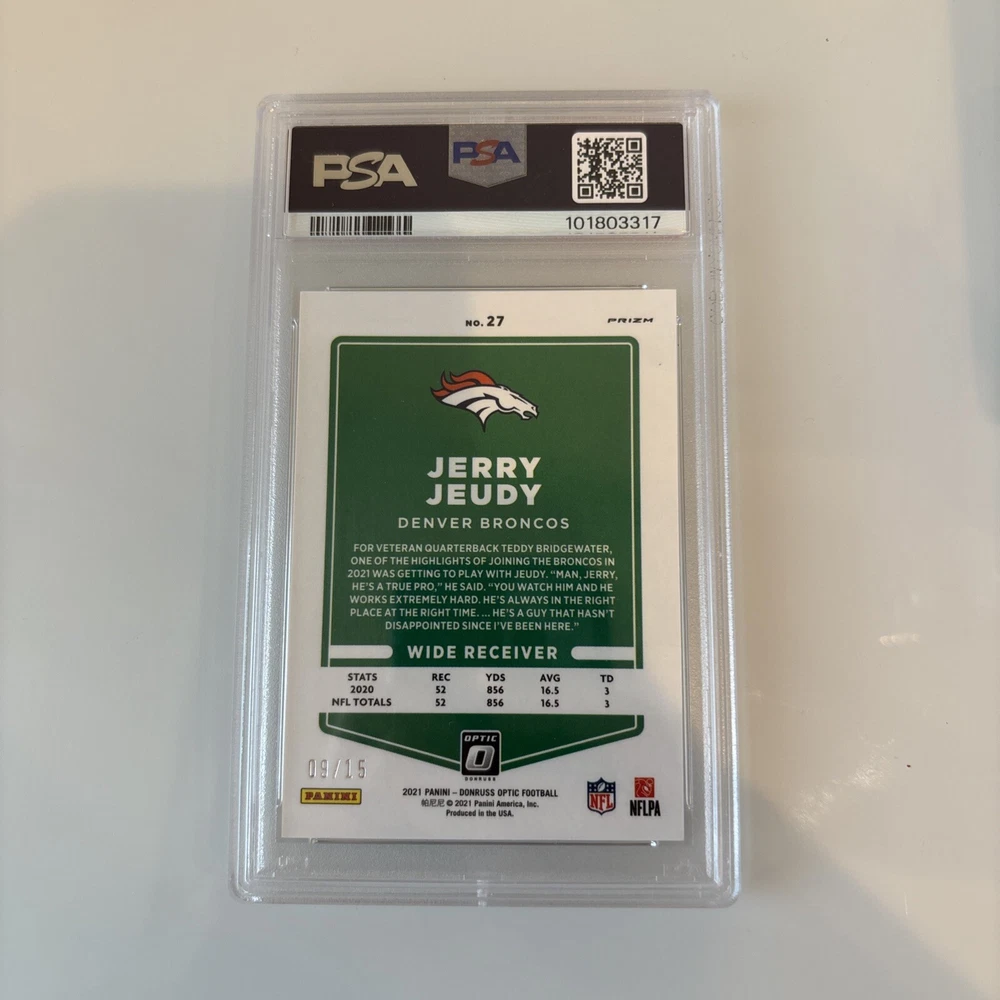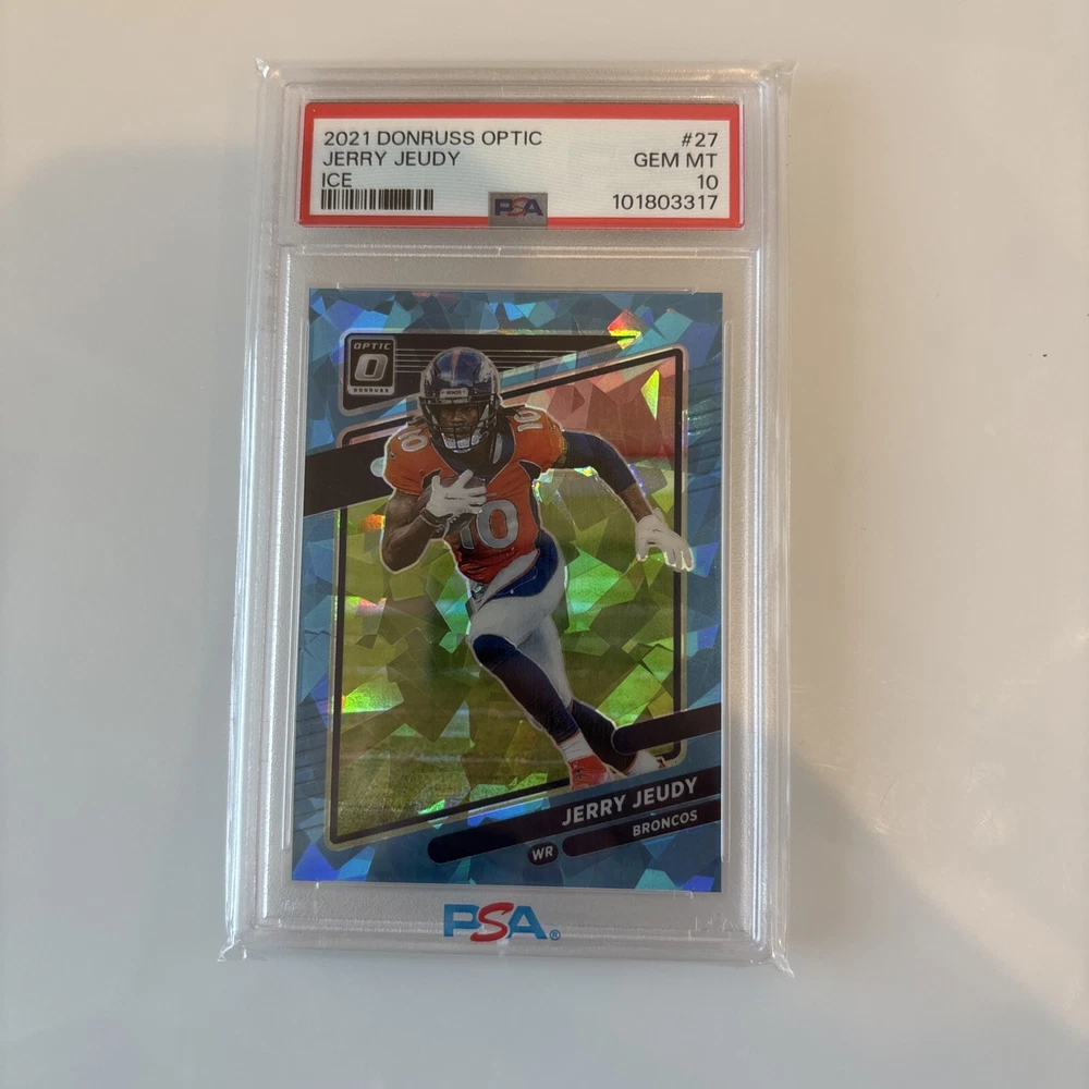 Elevate your sports card collection with the 2021 Donruss Optic Jerry Jeudy Ice card, a must-have for any enthusiast. Limited to a stunning 09/15, this rare find showcases the Denver Broncos' standout receiver in pristine quality. Graded a perfect 10 by Professional Sports Authenticator (PSA), the card's Optic parallel and captivating design make it a standout piece. With no autograph, the focus remains solely on the high-grade card's striking aesthetics and the athlete's prowess on the field. A noteworthy addition for collectors of NFL memorabilia or fans of Jerry Jeudy, this card encapsulates a moment from the 2021 season and is a testament to the player's potential and the sport's enduring legacy.