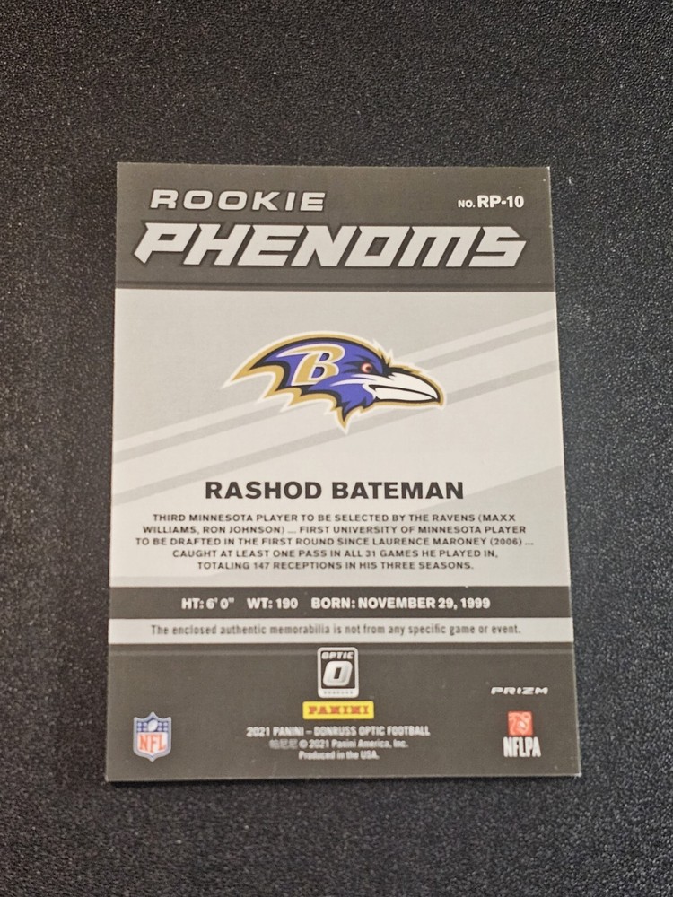 Autographed: No Manufacturer: Panini Type: Sports Trading Card Card Number: #RP-10 League: National Football League (NFL) Autograph Authentication: Donruss Season: 2021 Sport: Football Parallel/Variety: Blue Hyper Vintage: No Player/Athlete: Rashod Bateman Features: Memorabilia, Parallel/Variety, Rookie Card Name: Rashad Bateman rookie patch Team: Baltimore Ravens Insert Set: Rashad Bateman rookie patch Original/Licensed Reprint: Original Set: 2021 Donruss Optic