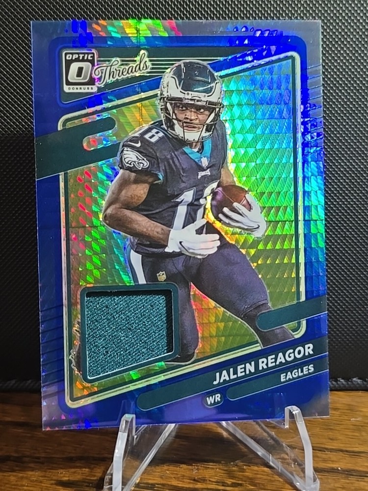 The 2021 Donruss Optic Threads Jalen Reagor Mem Patch Hyper Blue Eagles card features a memorabilia patch of Philadelphia Eagles player Jalen Reagor. This original sports trading card is part of the 2021 Panini Donruss Optic set and includes a patch variation, making it a unique addition for collectors of NFL trading cards. The card is in near mint or better condition and showcases Reagor as part of the National Football League (NFL) season.