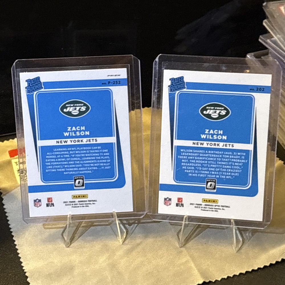 This is a 2021 Donruss trading card lot featuring two cards of New York Jets player Zach Wilson. The cards are from the Optic set and include a pink parallel and a base Rated Rookie card. They are made of card stock and are original licensed reprints. The cards are part of the National Football League (NFL) and are authenticated by Donruss.