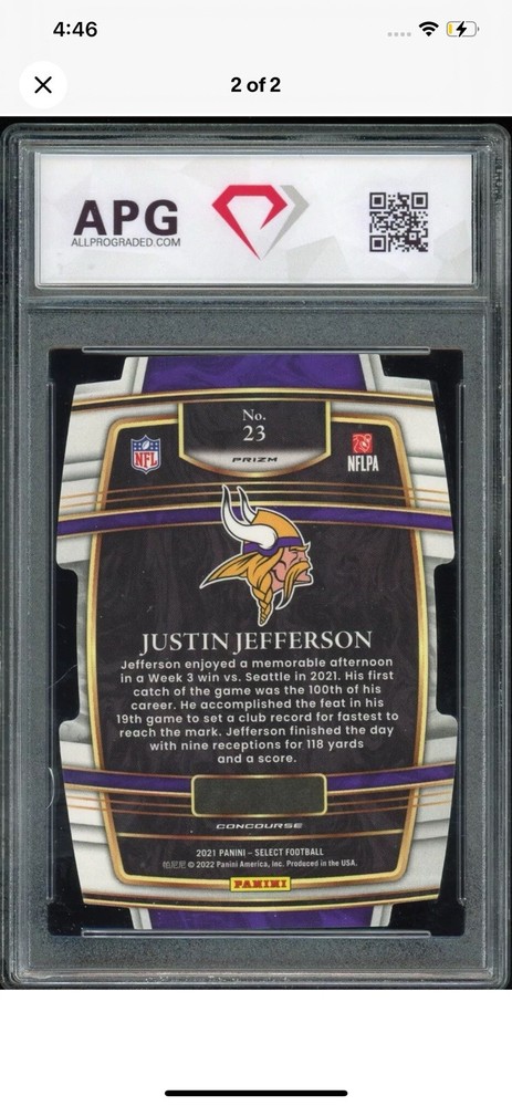 Elevate your sports card collection with the 2021 Justin Jefferson GEM MT 10 Panini Select Black & Gold Prizm Die-Cut #23. This card, a true gem for football enthusiasts, features the dynamic wide receiver in stunning detail. The Black Gold parallel variety adds an exclusive touch, making it a standout piece. Expertly graded as a perfect 10, this card showcases exceptional quality and preservation. Whether you're a fan of Jefferson, a collector of football memorabilia, or someone who appreciates finely crafted items, this card is a must-have. It's a brilliant representation of sports excellence and collecting artistry.