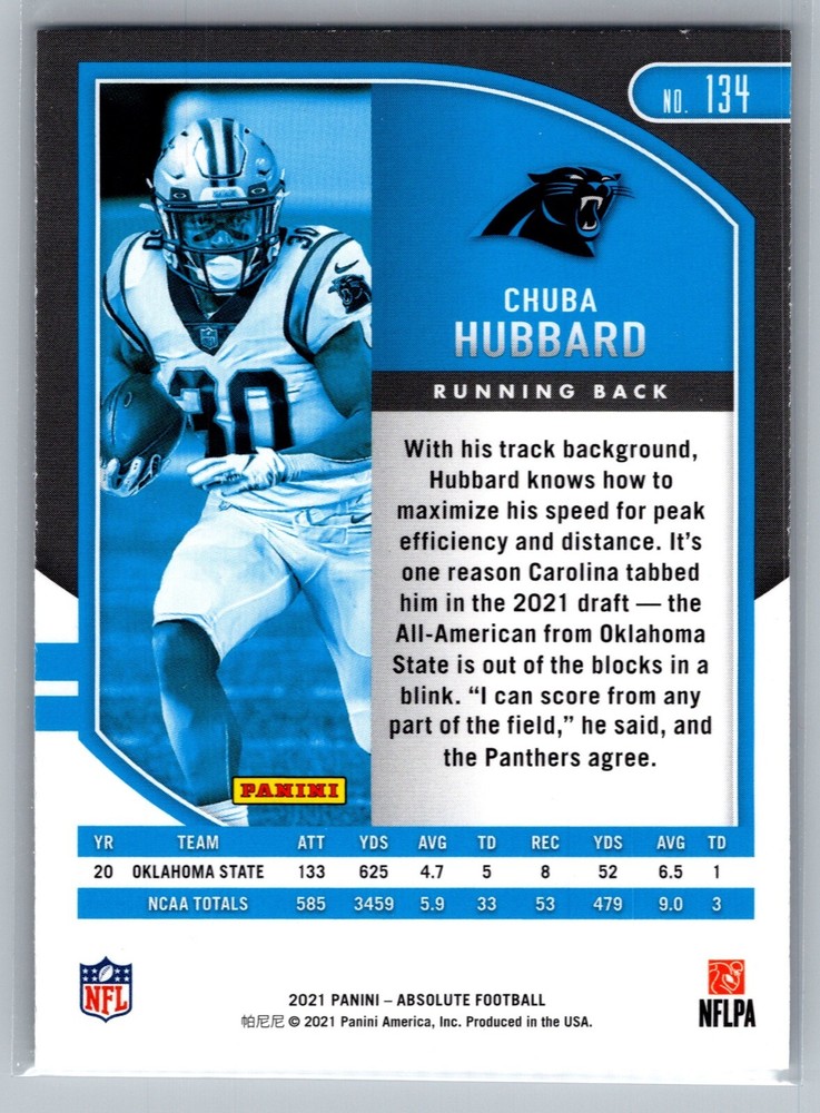2021 Panini Absolute - Rookies #134 Chuba Hubbard (RC)All cards are in Excellent condition or better. Some scans may show scratching of the penny sleeve. Please feel free to reach out for additional pictures. Thanks for looking!