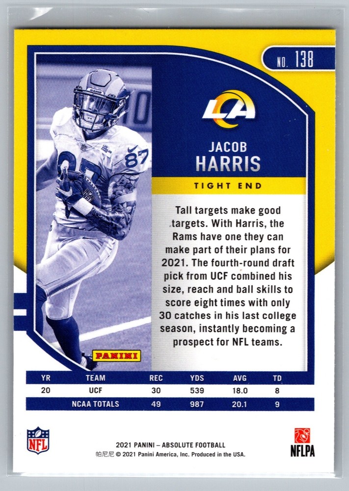 2021 Panini Absolute - Rookies #138 Jacob Harris (RC)All cards are in Excellent condition or better. Some scans may show scratching of the penny sleeve. Please feel free to reach out for additional pictures. Thanks for looking!