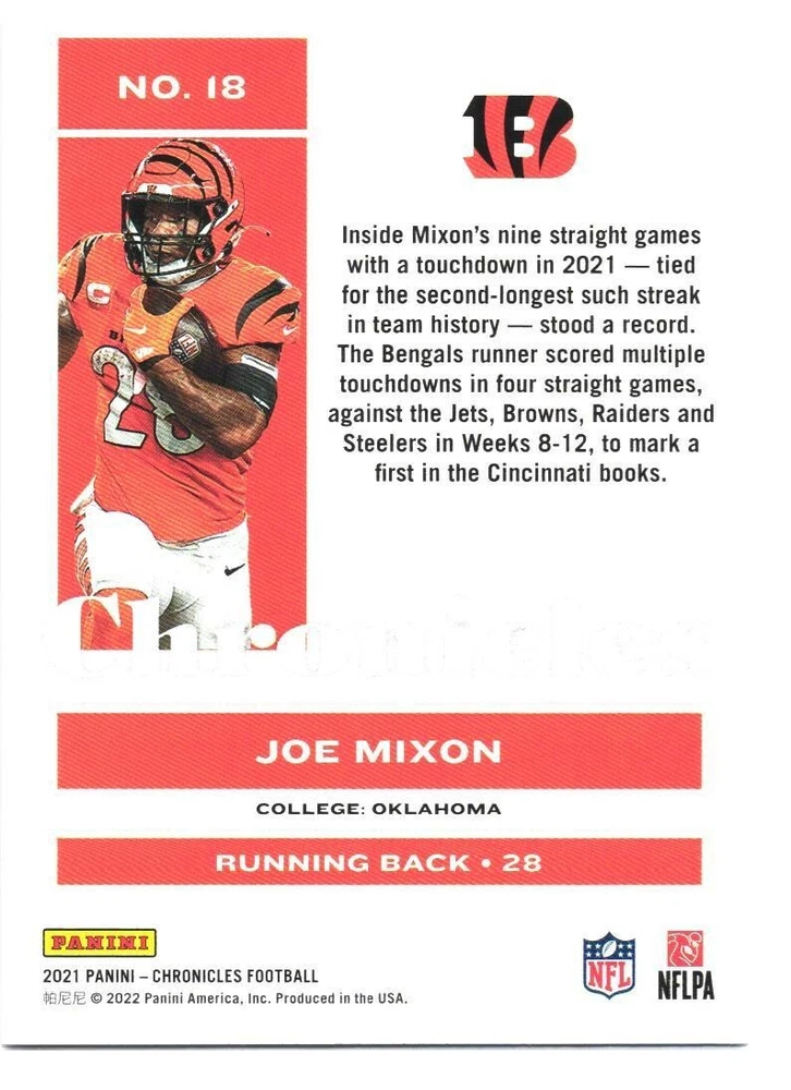 Card Number: 18 League: National Football League (NFL) Sport: Football Type: Sports Trading Card Team: Cincinnati Bengals Features: Parallel/Variety Season: 2021 Player/Athlete: Joe Mixon Set: 2021 Panini Chronicles Manufacturer: Panini