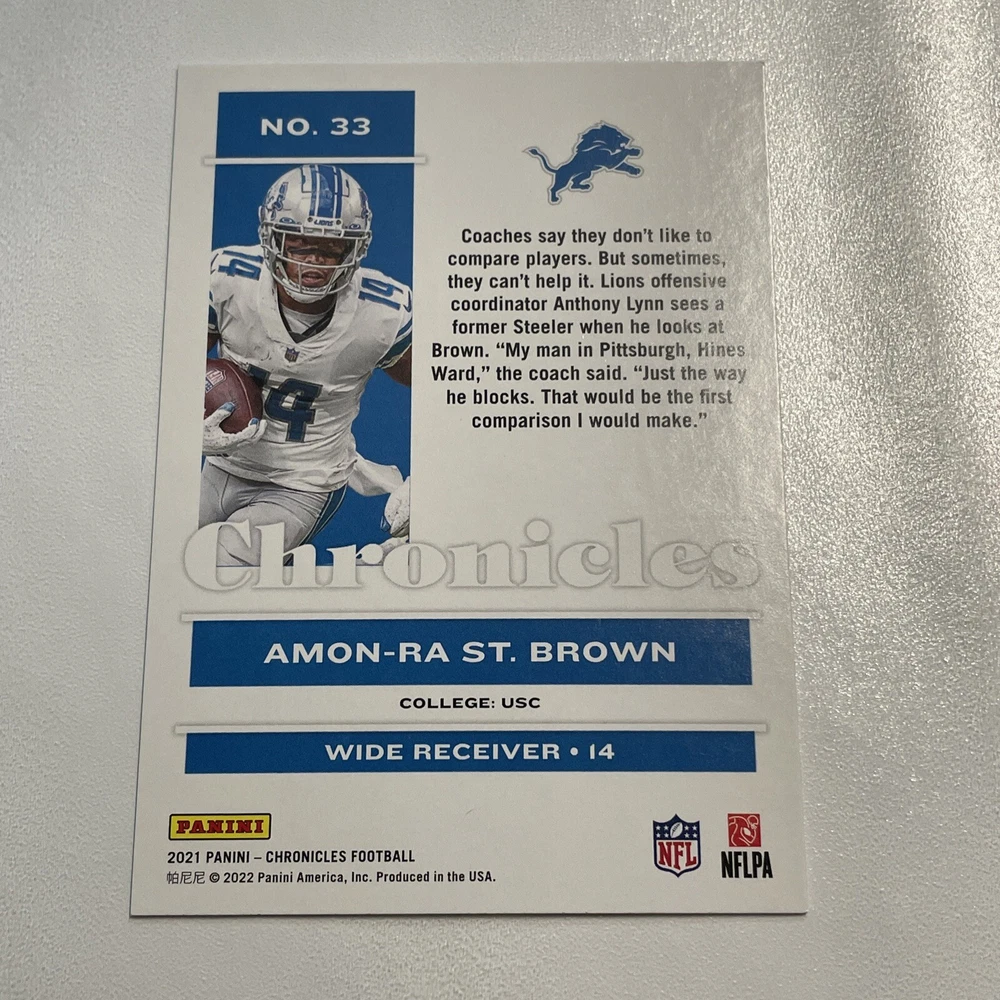 Language: English Set: 2021 Panini Chronicles Card Number: 33 Original/Licensed Reprint: Original Sport: Football Features: Parallel/Variety, Rookie Parallel/Variety: Pink Year Manufactured: 2021 Card Size: Standard Player/Athlete: Amon-Ra St. Brown Manufacturer: Panini Autographed: No Type: Sports Trading Card Team: Detroit Lions Vintage: No Season: 2021 League: National Football League (NFL)