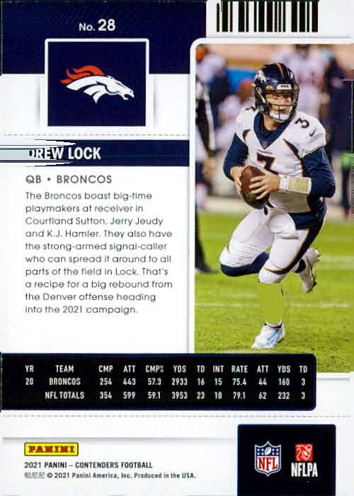 2021 Panini Contenders - #28 Drew Lock Card ships same day. Please see our other listings as we are happy to combine shipping to save you cost. We specialize in 1970's through 1990"s football commons and singles. Please check us out. Card ships same day. Please see our other listings as we are happy to combine shipping to save you cost. We specialize in 1970's through 1991 football commons and singles. Please check us out.