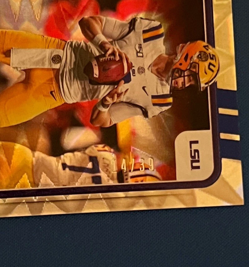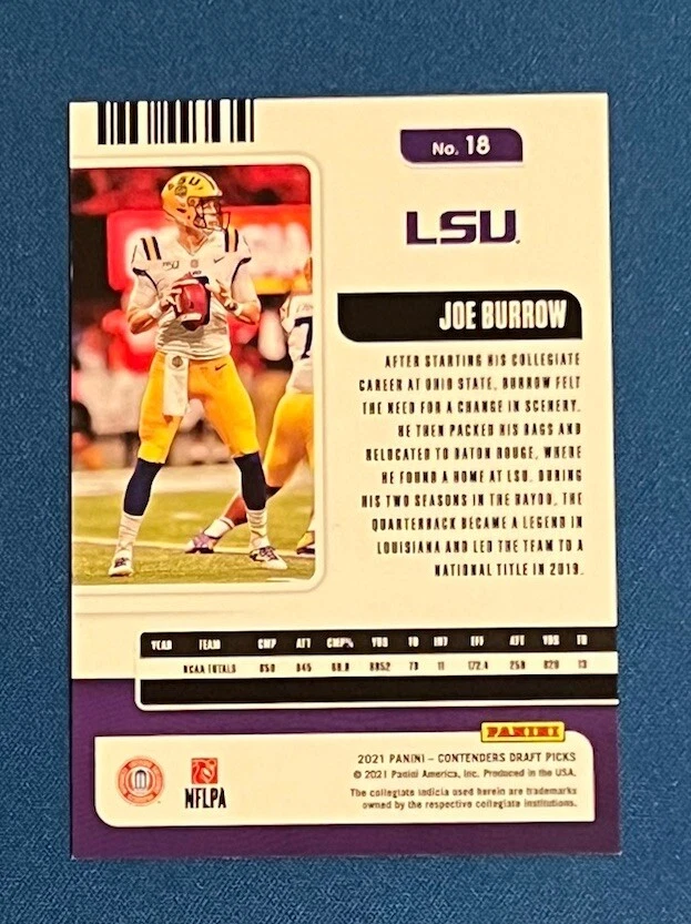 Card Number: 18 Type: Sports Trading Card Season: 2021 Manufacturer: Panini Year Manufactured: 2021 Set: 2021 Panini Contenders Draft Picks Parallel/Variety: Foil Player/Athlete: Joe Burrow Features: Base Set, Parallel League: NFL Print Run: 39 Sport: Football Team: Cincinnati Bengals, LSU Tigers Autographed: No Card Size: Standard