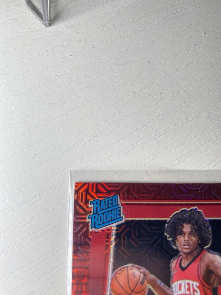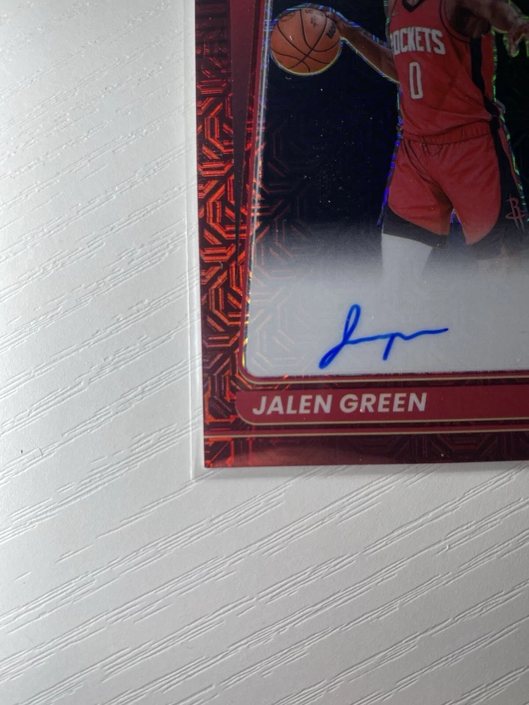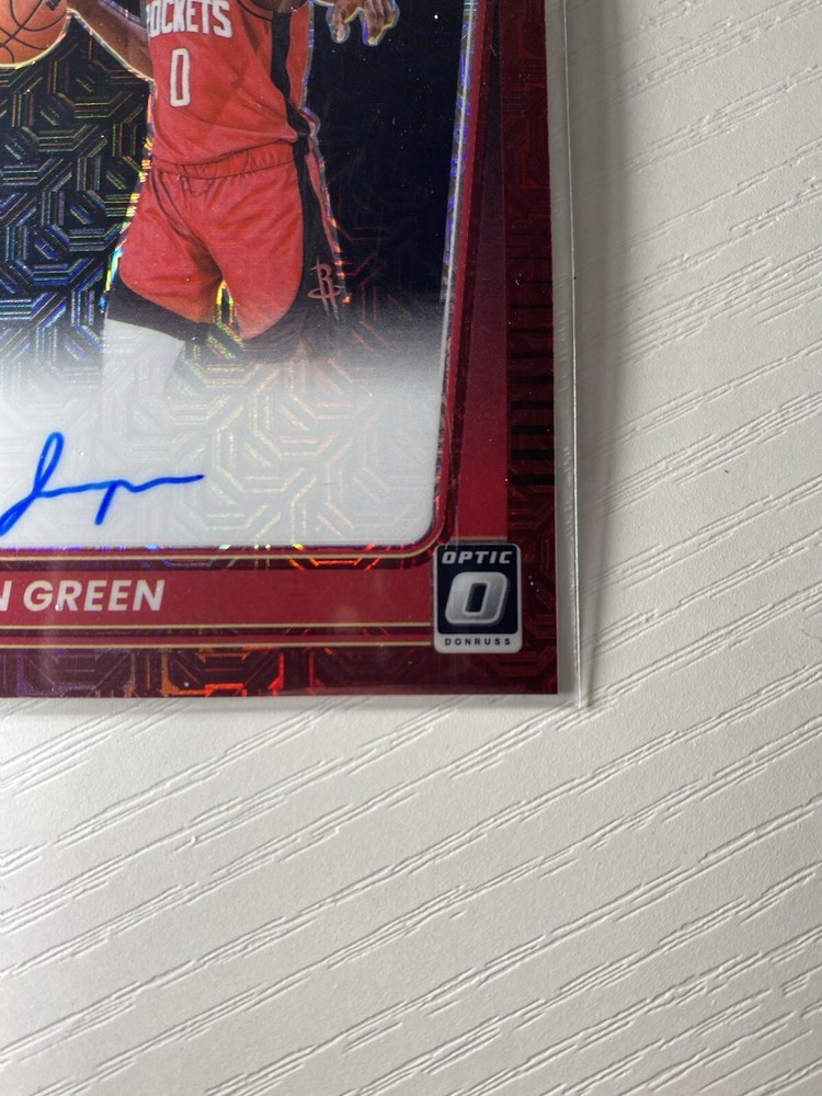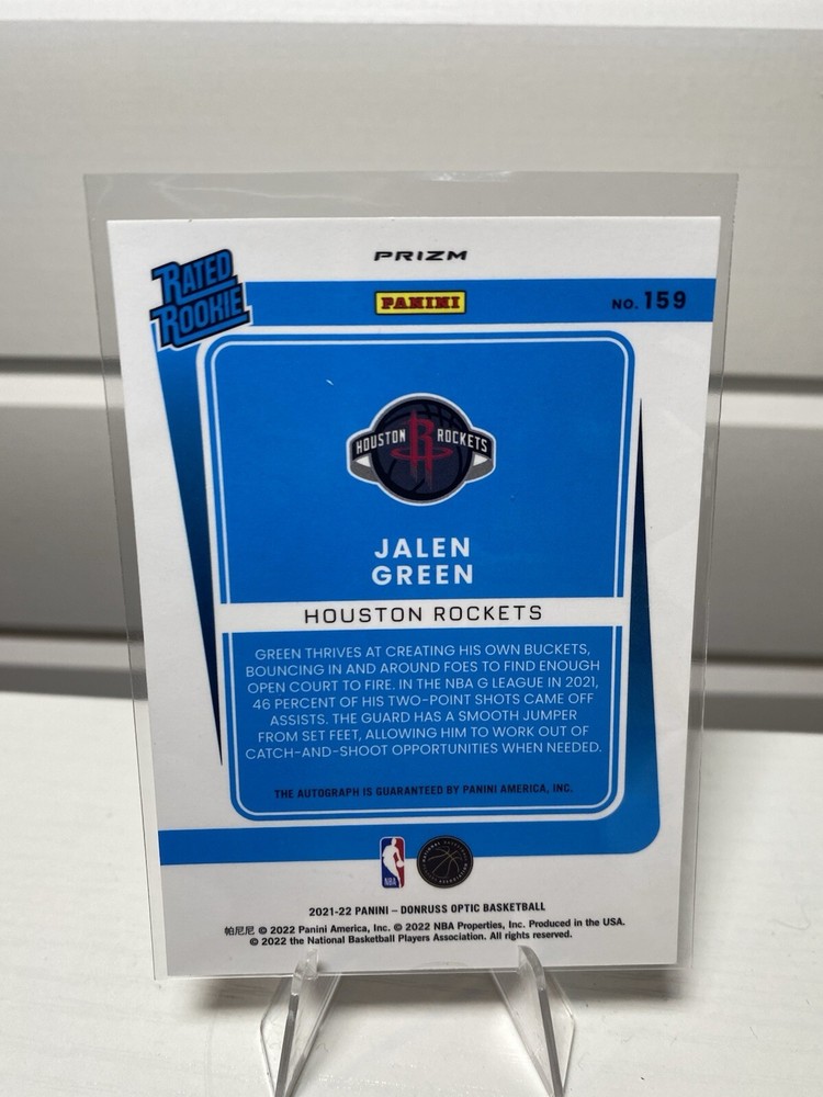 The 2021-22 Panini Donruss Optic Jalen Green Red Rated Rookie Auto trading card features an autographed card of Jalen Green, a rookie player for the Houston Rockets in the National Basketball Association (NBA). This SP (short print) card is in near mint or better condition, made of card stock, and is an original release by Panini. The card is part of the Red Choice parallel/variety set, with card number 159, from the 2021-22 season. It is a highly sought-after collectible for basketball fans and card collectors alike.