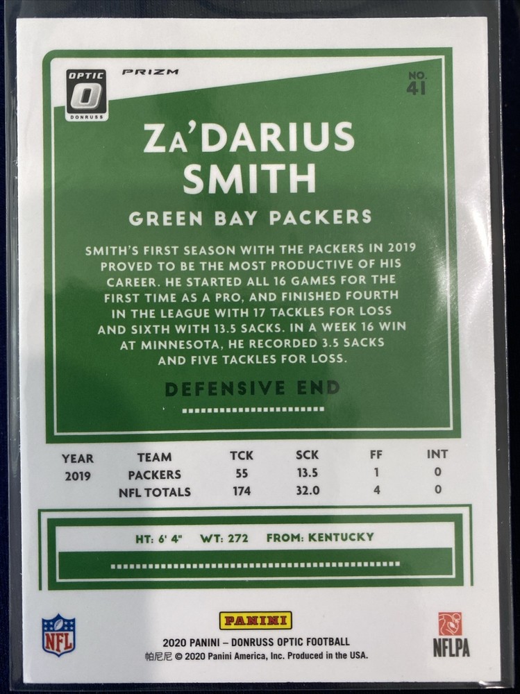 This card is a must-have for any serious collector! The White Sparkle Prizm finish makes Za'Darius Smith pop with a stunning shimmer that stands out in any display. As part of the 2021 Donruss Optic set, it’s a high-quality addition with sharp details and vibrant colors. Whether you're a Packers fan or just appreciate elite defensive players, this SSP parallel is a rare gem that elevates any collection. Panini delivers again with this eye-catching piece—definitely a standout in my lineup!