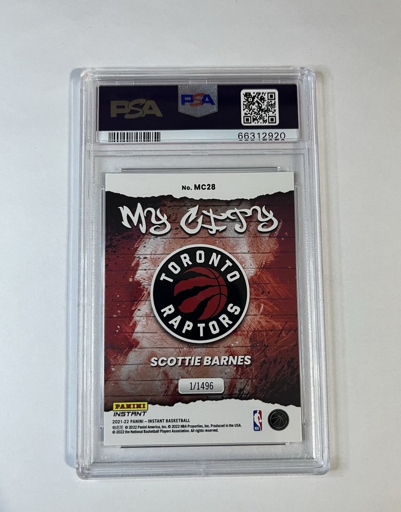 The product is a 2021-22 Panini Instant - My City trading card featuring Scottie Barnes of the Toronto Raptors. This rookie card has a card number of MC28 and is limited to 1496 copies. Graded as a PSA 9, this original sports trading card showcases Barnes in his rookie season in the NBA. The card is part of a single-insert set by Panini America, Inc., known for producing high-quality basketball trading cards. This collectible item is a great addition to any basketball card collection, especially for fans of Scottie Barnes or the Toronto Raptors.