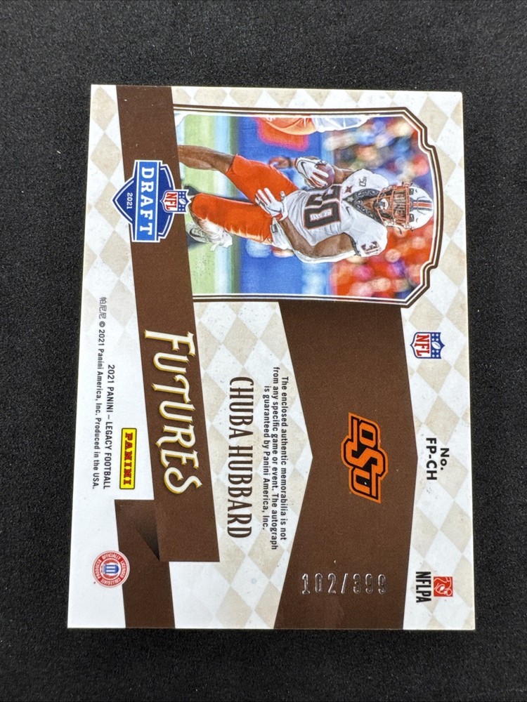The 2021 Panini Legacy Chuba Hubbard Futures Rookie Patch Auto #/399 trading card is a highly sought-after collectible featuring the autograph of Chuba Hubbard, a promising football player from the NCAA and NFL. This limited edition card is part of the 2021 Panini Legacy set, making it a valuable addition to any sports trading card collection. The card is a Silver parallel variety with a limited card number of 399, showcasing a unique design and highlighting the talent of Chuba Hubbard as a rookie player for both the Carolina Panthers and Oklahoma State Cowboys.