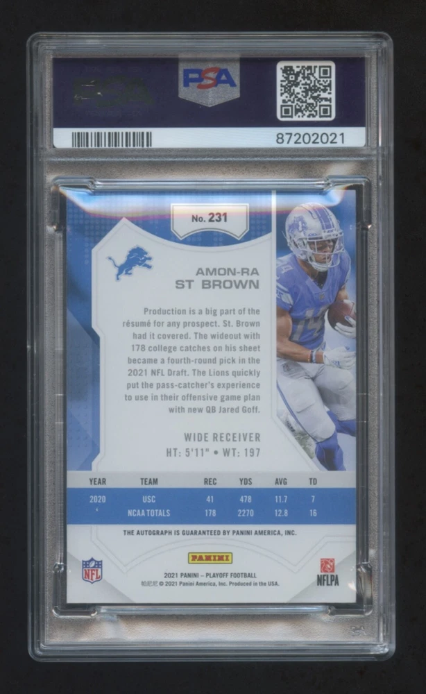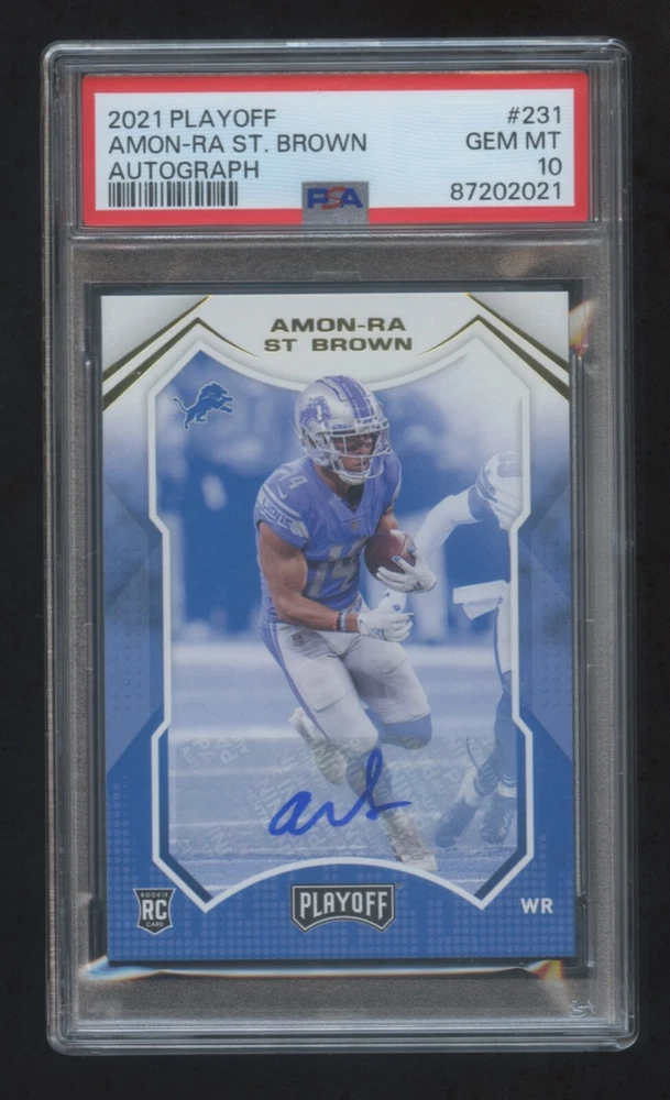 This 2021 Panini Playoff card features Amon-Ra St. Brown, a promising rookie in the sports trading card world. The card is well-preserved and is in excellent shape, maintaining its original quality since its release. It is a great addition to any collection, especially for fans of the Detroit Lions wide receiver. This autographed card is a must-have for any serious collector or sports enthusiast.