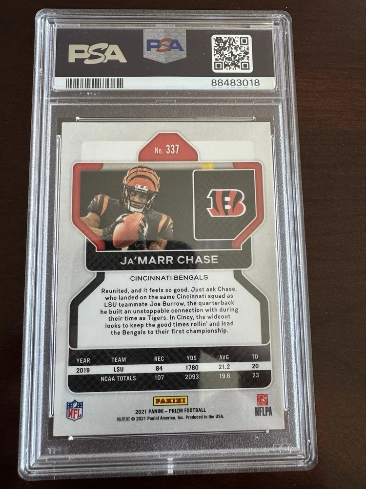 This is a 2021 Panini Prizm Ja'Marr Chase rookie trading card, featuring the wide receiver for the Cincinnati Bengals in the National Football League (NFL). The card is graded as a Gem Mint PSA 10 by Professional Sports Authenticator (PSA), indicating it is in pristine condition. It is an original licensed reprint in English, part of the 2021 NFL Prizm set, with a card number of 337. This card is a sought-after collectible for fans and collectors of football trading cards, highlighting a rising star in the sport.