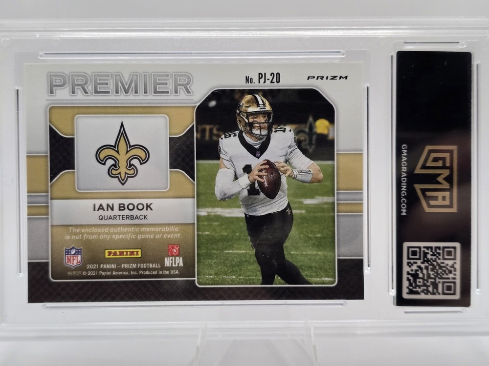 Elevate your sports memorabilia collection with the 2021 Panini Prizm #PJ-20 Ian Book Rookie Patch Premier Jerseys card in Pink. This stunning piece showcases Ian Book in his New Orleans Saints gear, making it a must-have for fans and collectors alike. The card, part of the Premier Jerseys Pink Rookie Patch insert set, features a swatch of game-worn jersey, adding a tangible piece of sports history to your assemblage. Graded a 9 by Gem Mint Authentication (GMA), this card strikes the perfect balance between quality and prestige. Whether you're a die-hard NFL enthusiast or a connoisseur of rookie cards, the Ian Book Prizm jersey card is a standout addition. Cherish the beginnings of what could be a storied career with this gem from the 2021 NFL season. All sales will include 1 random base or parrallel from any sport from any era.