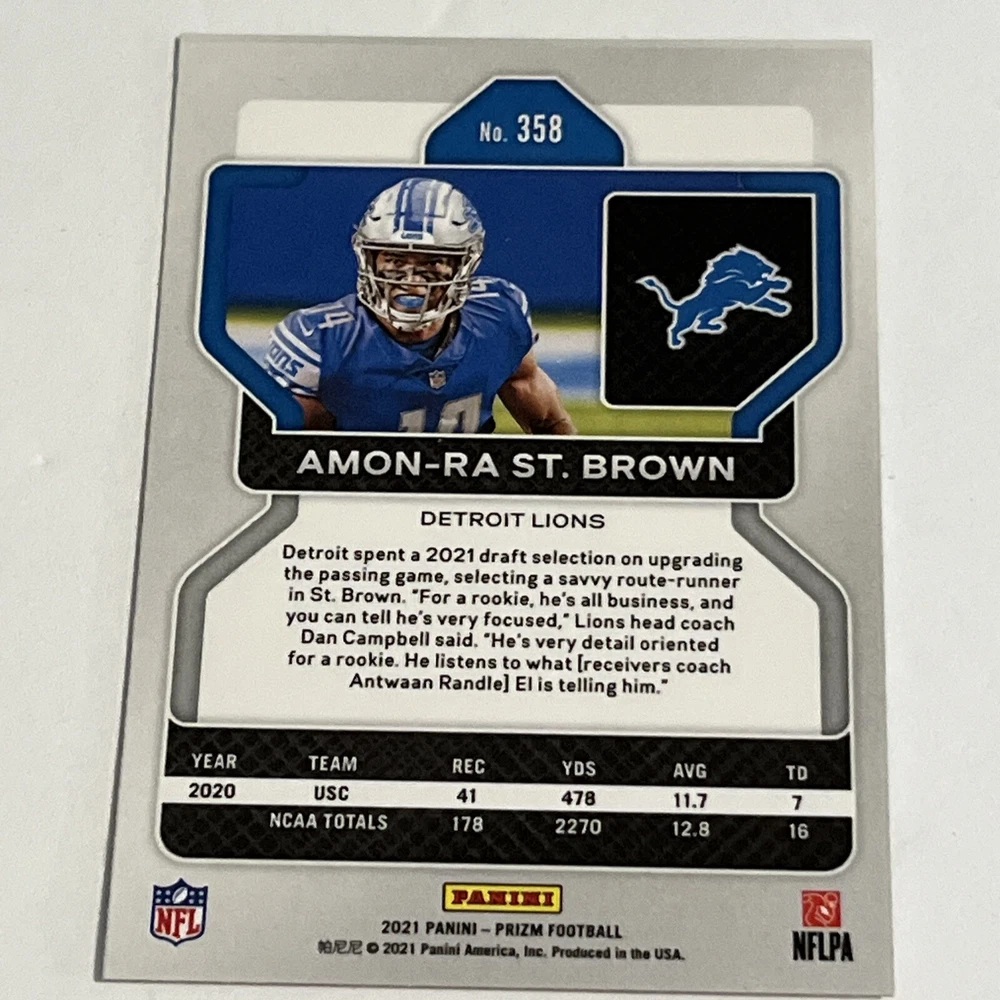 For avid collectors of sports trading cards, here is a rare chance to get your hands on a 2021 Panini Prizm Rookie #358 Amon-Ra St. Brown (RC). This card features a promising football player who is sure to make a name for himself in the sport. The card is well-preserved and is in excellent shape, maintaining its original quality since its release. It is a great addition to any collection and is perfect for fans of Amon-Ra St. Brown or football enthusiasts in general. Don't miss out on the opportunity to own this valuable trading card.