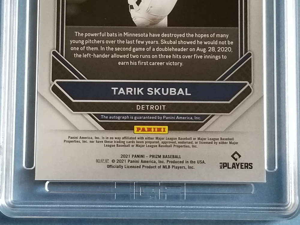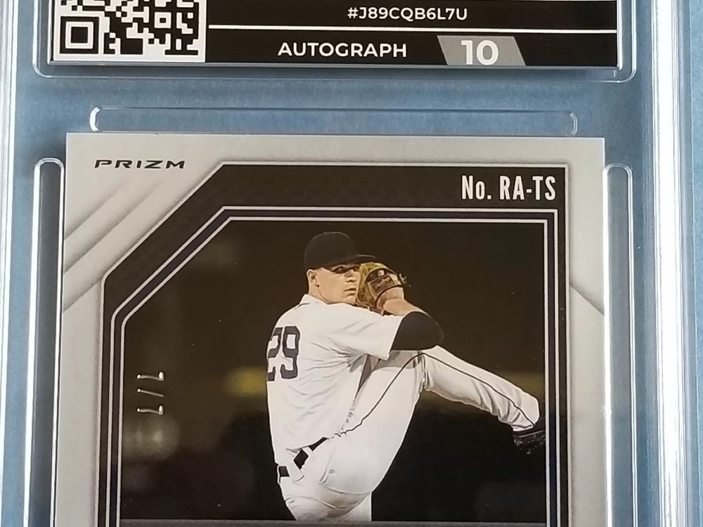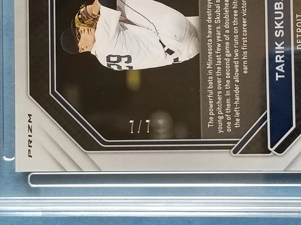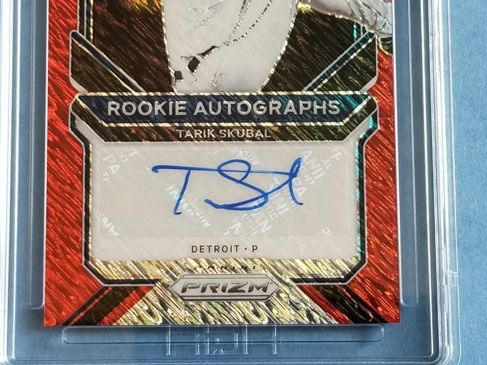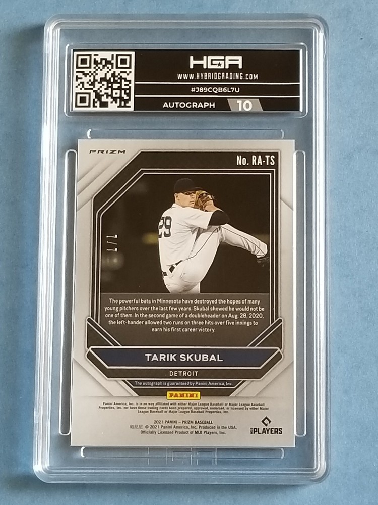 Item For Sale: 2021 Panini Prizm Baseball First Off The Line "Red Shimmer" Prizm Rookie Autographed card of Detroit Tigers Superstar Pitcher TARIK SKUBAL Card # RA-TS. SERIAL #'D- 7/7. Card has been graded by HGA as a GEM Mint 9.5 Sub-Grade include: Corners: 9.5 Surface: 10.0 Edges: 10.0 Centering: 9.5 This is the extremely limited First Off the Line Shimmer Prizm Parallel, exclusive to FOTL Boxes, limitedto just 7 copies. You will be receiving the exact card shown in the images, please review before purchasing. Card will be shipped to you inside a team bag, between cardboard, bubble wrapped, placed inside a leaf trading card box & mailed inside a priority box for added protection, with tracking. Items over $200 will include insurance with the tracking. Payment is due with 7 days of auctions and or item will be relisted.