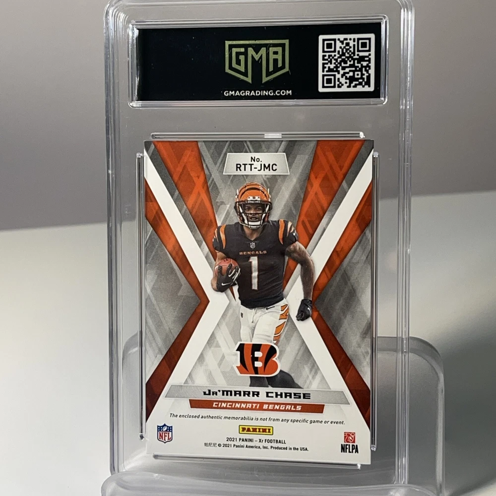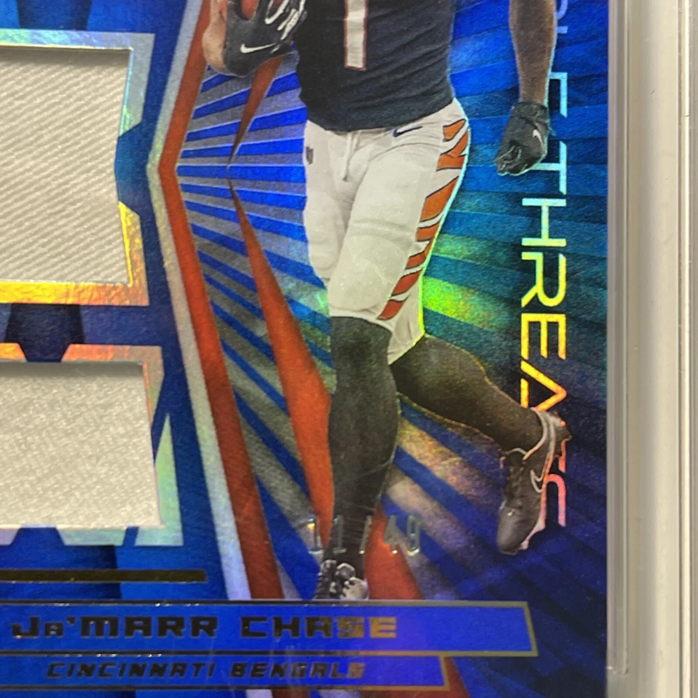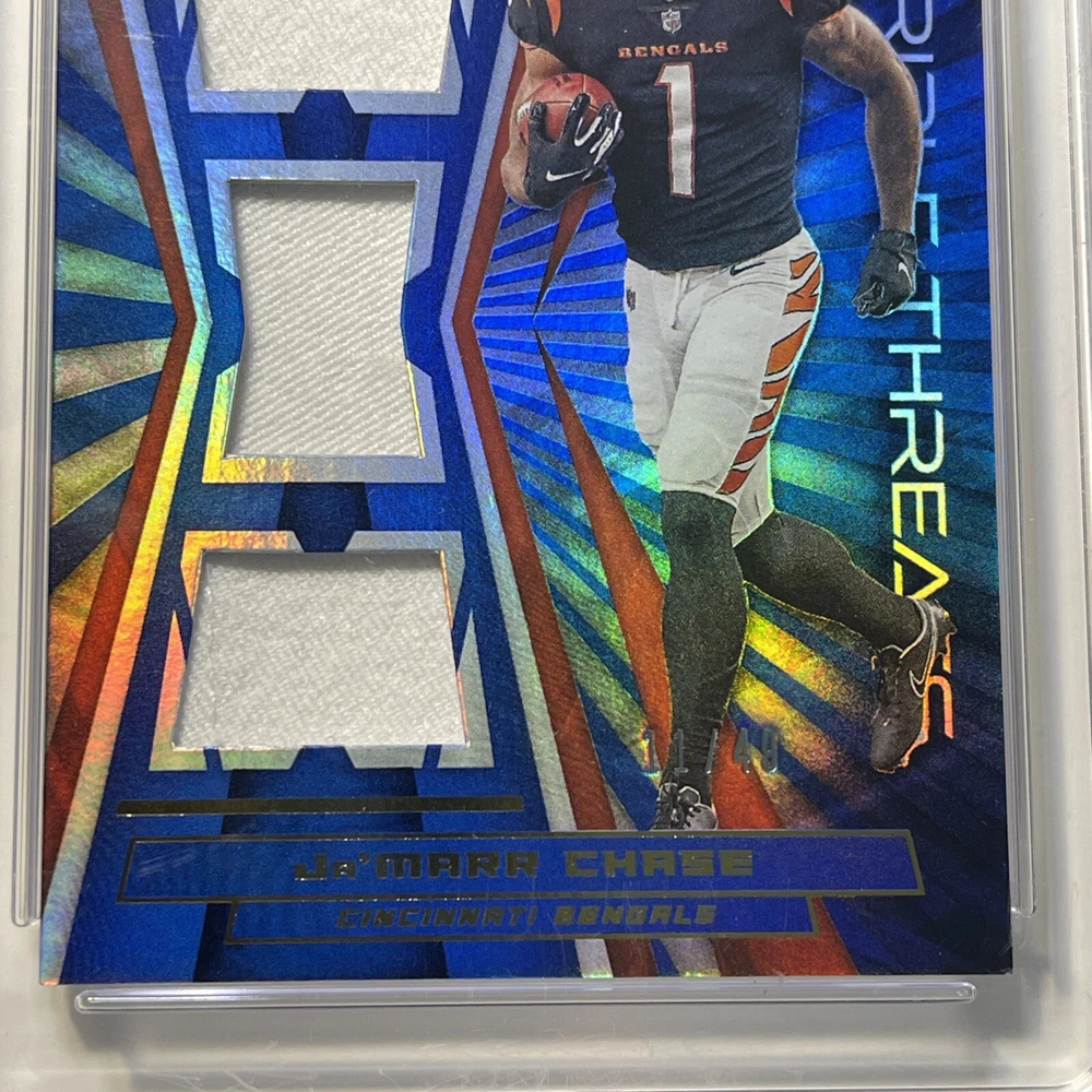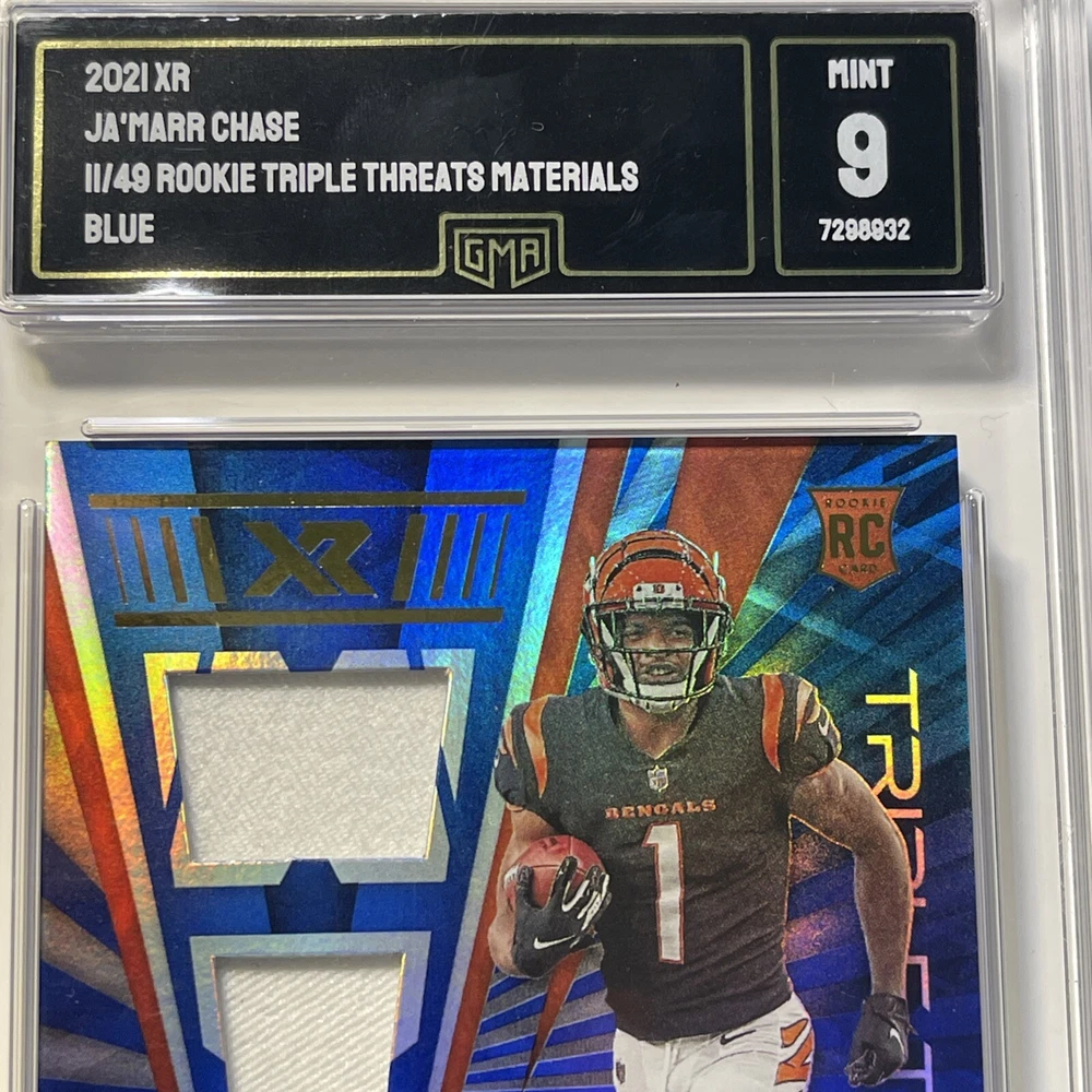 Elevate your football card collection with the 2021 Panini XR Rookie Triple Threats Blue #RTT-JMC featuring the dynamic wide receiver Ja'Marr Chase. Limited to just 49 copies, this card is a prime piece with a blue material variety, showcasing Chase's potential in his rookie season. Panini's quality is renowned, and this card comes with the assurance of a Gem Mint Authentication grade of 9, ensuring its prestige and longevity. Whether you're a dedicated fan or a serious collector, this card is a significant addition to any collection.