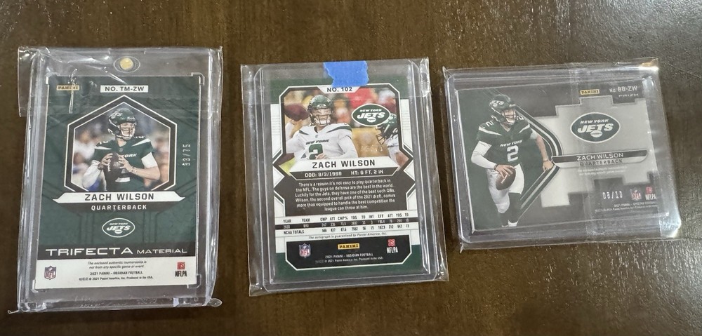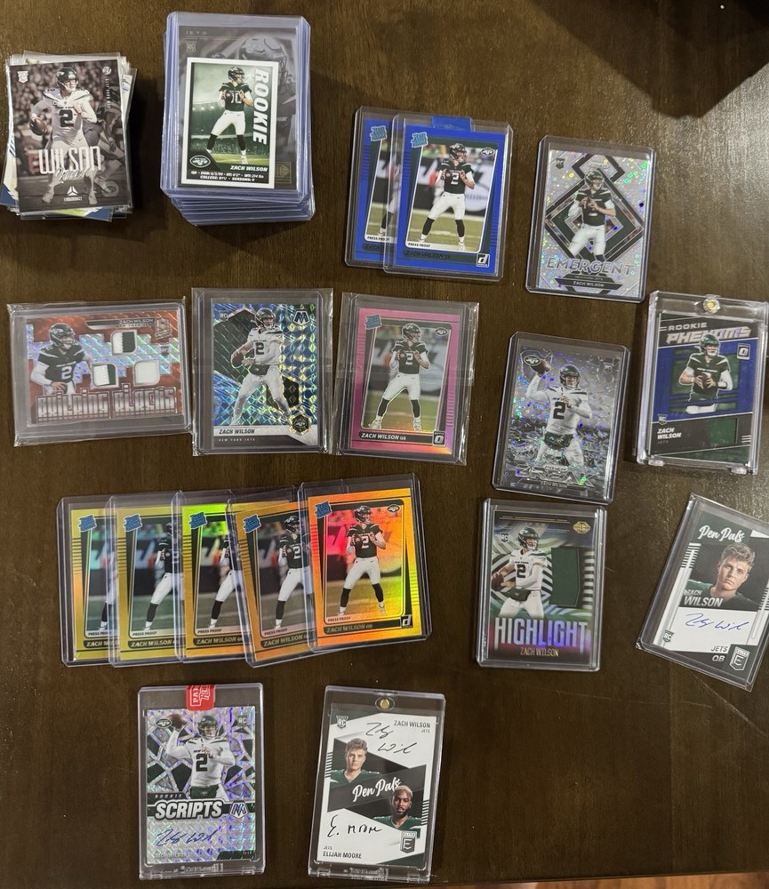 Elevate your collection with the 2021 Panini Zach Wilson Rookie Lot, a treasure trove of autographed and numbered cards, featuring a mix of New York Jets, BYU Cougars, and Miami Dolphins memorabilia. This extensive set includes over all, each showcasing the potential of quarterback Zach Wilson in his rookie season. Highlights include serial numbered inserts, short prints, and a variety of parallels that will impress any NFL enthusiast. Crafted in the United States, each card in this lot is a testament to the quality that Panini is known for. While ungraded, the cards maintain a high standard of preservation, ensuring that they remain a valuable asset for years to come. With original licensing, these cards are the real deal—authentic collectibles for fans and investors alike. ALL CARDS SHIP. Value, Value, Value.