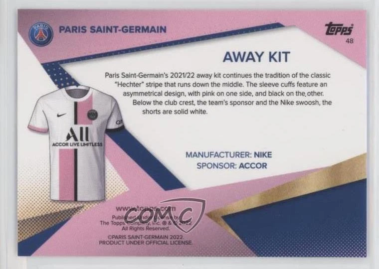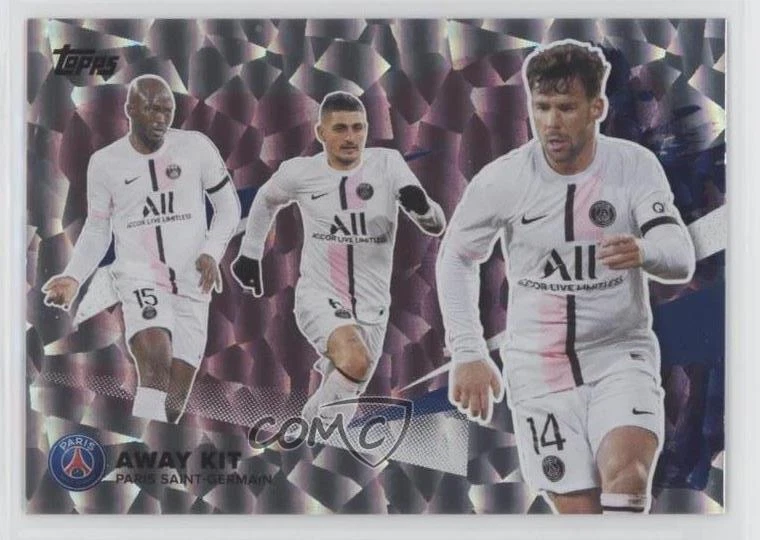 2021-22 Topps Paris Saint-Germain Team Set - [Base] - Icy Foil #48 Kit Cards - Danilo Pereira, Juan Bernat, Marco Verratti - Soccer Card - Featuring the Paris Saint-Germain - Featuring Danilo Pereira , Juan Bernat , Marco Verratti and Paris Saint-Germain Search for more: 2021-22 Topps Paris Saint-Germain Team Set Search for more: 2021-22 Topps Paris Saint-Germain Team Set - [Base] - Icy Foil View all of our Listings Auctions Buy It Now About Us Located in the beautiful Pacific Northwest, COMC (Check Out My Cards) is the world's largest consignment service for trading card singles. More than 10,000 people have used our consignment service to list over 50 million trading cards. We currently house 20 million cards, each listed for sale with front and back images of the actual card. Find out how we can help you consign your items on eBay by contacting us through eBay messaging. COMC -- "The Safe & Easy Way to Buy & Sell" Representative Image - Select Specific Item above to see image of actual item Representative Image - Select Specific Item above to see image of actual item Raw Condition for Modern Cards Unless otherwise noted, raw modern cards are listed in Near Mint-Mint condition or better. A NM-MT card appears to be Mint at first glance, but upon closer inspection, may exhibit some of the following: minor print defects (e.g. roller marks, print line, dimple), minor scratches, slight edge wear, and slight corner wear. Centering is clearly visible in the images provided and does not factor into our condition assessment. Raw Condition for Vintage Cards Unless otherwise noted, raw vintage cards are listed in Excellent condition or better. An EX card may exhibit some of the following: minor rounding of corners, surface wear, print defects, light scratches, and slight edge wear/chipping. Centering is clearly visible in the images provided and does not factor into our condition assessment. Domestic Shipping Combined shipping for multiple items is available. To receive combined shipping, please ensure all desired items are in your eBay shopping cart before proceeding to checkout. eBay limits orders to 40 items per order. We automatically combine multiple orders placed on the same day. If you place multiple orders on the same day, please contact us to request a refund of applicable shipping costs. Signature confirmation may be required on invoices over $400. Raw cards are shipped in toploaders. International Shipping COMC offers eBay's International Shipping (EIS) for international orders under $2,500* (see country exceptions below). All duties and import fees are paid at checkout; in the rare event that there are additional import fees upon delivery, these are borne by the buyer. EIS packages route through a shipping hub in Erlanger, KY before shipping to their final destination. Please note that EIS does not allow for combined shipments. The shipping rates are determined by eBay and cannot be adjusted. *Maximum sale price exceptions: Colombia, Kuwait ($2,000); Taiwan ($1,539); Chile, Costa Rica, Guatemala, Honduras, Trinidad and Tobago ($1,000); Antigua and Barbuda, Aruba, Belize, Dominica, Grenada, Philippines, Saint Kitts and Nevis, Saint Lucia, Montserrat, Turks and Caicos Islands ($500); Dominican Republic, El Salvador ($200). Please request a shipping quote through eBay messaging for orders that exceed the maximum sale price supported by eBay's International Shipping. You will be responsible for all duties and import fees for international orders shipped outside the EIS. Raw cards are shipped in toploaders. Payment COMC does not accept offers on our cards through our eBay storefront. COMC utilizes eBay’s managed payments system. If you are experiencing difficulties making a payment, please contact eBay for assistance. Return Policy Returns are only accepted on the rare occasion the item is not as described. If you are making a return, please initiate the return process through eBay so a mailing label can be provided for you. Prior to listing, our expert team carefully assessed this item to represent it accurately. Please review the description and high-definition images prior to purchasing to ensure this item meets your satisfaction. We welcome you to contact us if you have further questions about this item. Trust and Integrity COMC carefully assesses each item consigned to us to prevent fraudulent items from entering the marketplace. If you believe an item offered on COMC may be fraudulent, please contact us with details so we can investigate the issue. Items we determine are outside our supported items policy may be removed. Last Modified: 12/9/2024 9:59:28 AM PDT