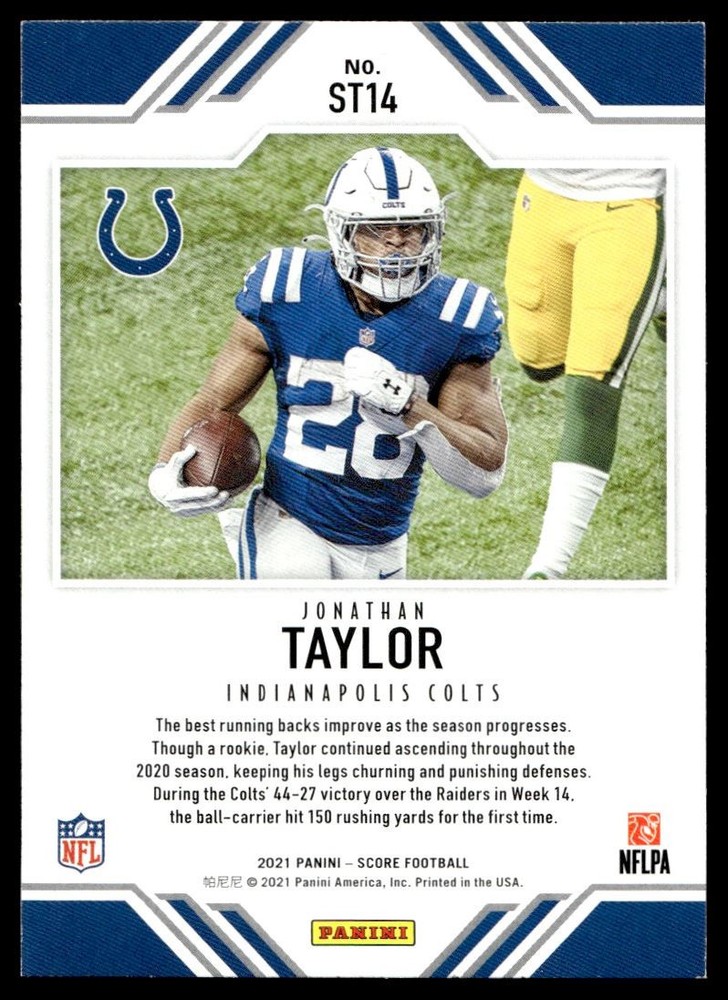 About Me Other Listings Feedback Add to Favorites Contact Me eBay Store JEm_Mint_Trading 2021 Score Team Jonathan Taylor Indianapolis Colts #ST14 No stock photo / These are real scans or pictures Details Description: Jonathan Taylor Category: Football Year: 2021 Product: Score Team Team: Indianapolis Colts Card Number: ST14 Dimensions: 3½" x 2½" SKU: FT A0014 R01 N (5) Listing By Kronocard trading cards software v2.8.2.3