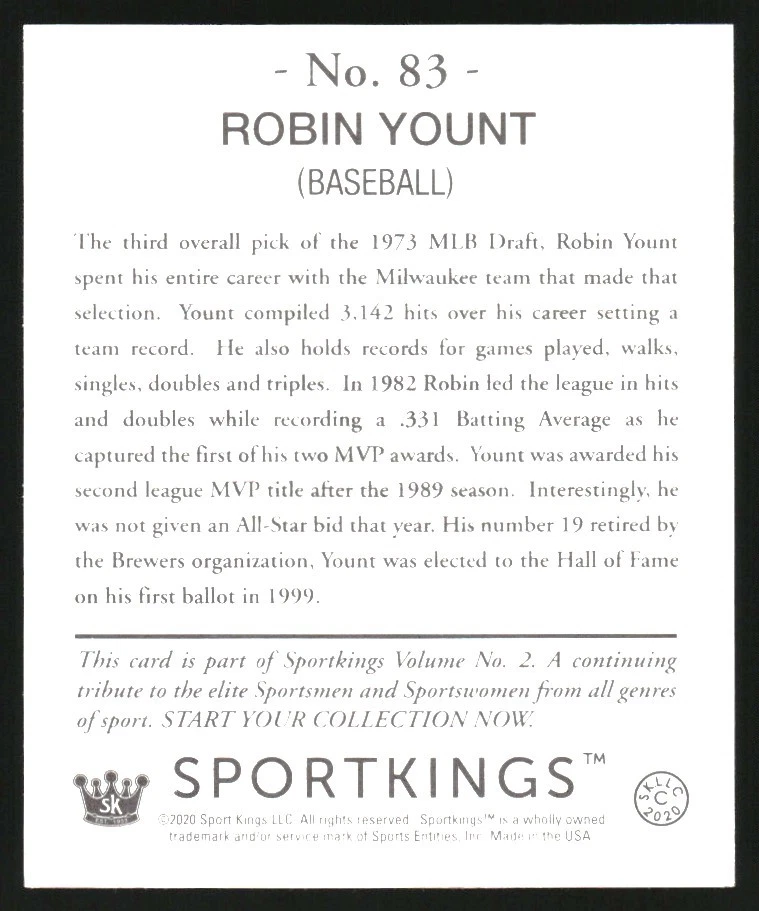 2021 Sportkings Volume 2 Mini #83 Robin Yount Front Back Sport: Multisport Set: 2021 Sportkings Volume 2 Mini Year: 2021 Item#: 83 Player: Robin Yount Brand: Sage Sportkings Manufacturer: SAGE Grading Company: Raw Grade SetType: Parallel Item Condition: Near Mint/Mint 2014 Beckett Collectibles, LLC. All Rights Reserved Powered by: Thank you for choosing Burbank Sportscards, the sports cards superstore. We offer a large selection of singles across all sports. Visit our ebay store to view all our items available. Our Shipping Policy We offer Free Standard Shipping to all Domestic customers. Options for Expedited shipping are also available at checkout. For our international customers, shipping is $9.99 for the first item, and $0.25 for each additional item. Note to all customers: To qualify for combines shipping, we ask our customers to add items into the shopping cart. Please note, we do not combine orders that are placed separately. Our Service: Generally, our turnaround is super quick as we process and send out orders same day payment is received. Stock Availability: We do our best to ensure all items are in stock; however, in case of the rare stock out, the customer will have the option for a replacement card, or we will process a refund so the order is not held up. Our Images: Many of our images are stock photos from Beckett archives. They are a representation of the actual card you would receive. If you have any questions regarding the item you're interested in, please feel free to ask (serial numbers and relic pieces may vary) Moreover, in a case of a wrong or defective photo, please notify us, so we can adjust it. Other FAQ's: -When buying multiple cards, do you top load each item? No; however, we do try to insure all items are shipped securely. If you wish to have all of your cards top loaded it is a paid service and can be arranged. Please email for more details. For other questions, please feel free to ask. Thank you.