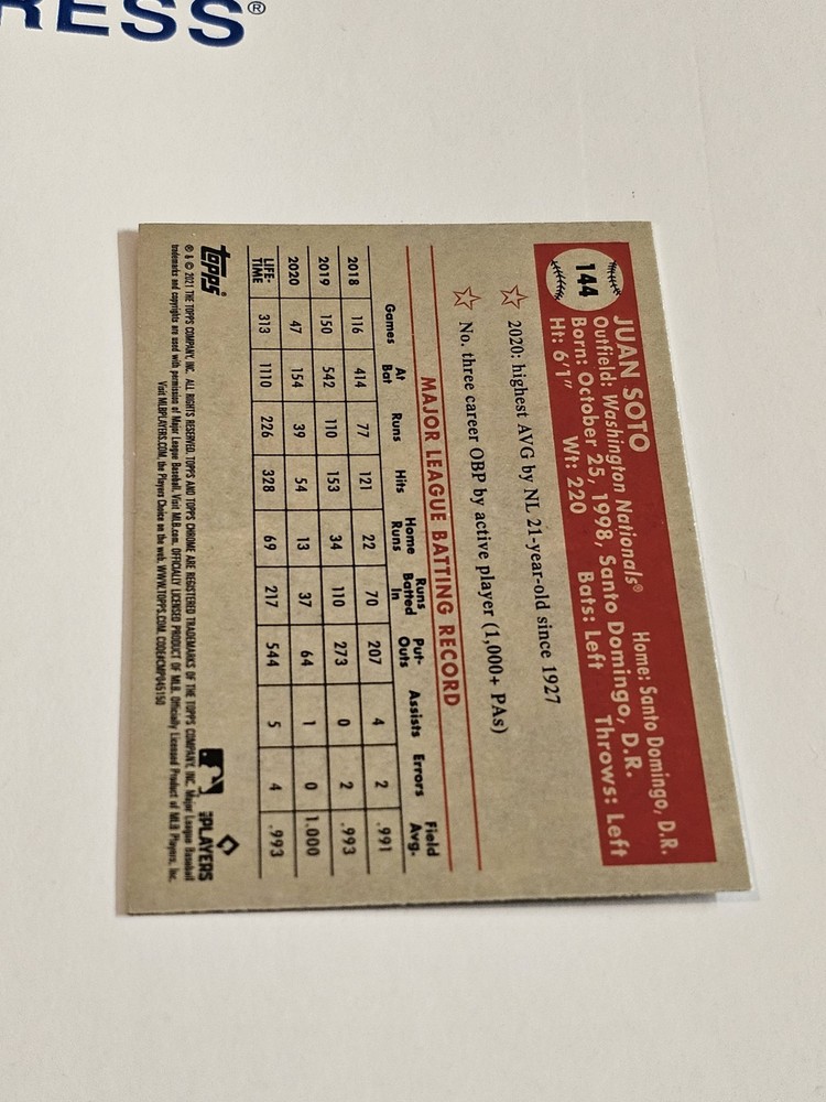 This is a 2021 Topps Chrome Platinum Anniversary trading card featuring baseball player Juan Soto. The card belongs to the Base Set and has card number 144. It was manufactured in 2022 and showcases Soto who plays for the Washington Nationals. The card may also include images or information related to the New York Yankees and San Diego Padres teams.