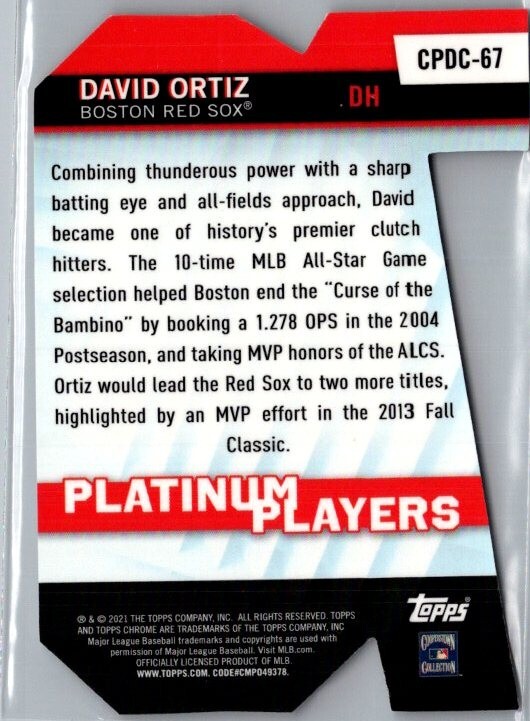 Elevate your baseball card collection with the 2021 Topps Chrome Update Series featuring the iconic David Ortiz of the Boston Red Sox. This special edition card, numbered CPDC-67, is part of the sought-after Target Platinum Player Die-Cuts insert set, showcasing a unique design that captures the essence of one of MLB's most respected power hitters. Crafted by Topps, a trusted name in sports memorabilia, this card is a must-have for fans and collectors alike. Celebrate the 2021 season and the storied career of David Ortiz with this striking addition to your sports trading card collection, a tangible piece of baseball history.
