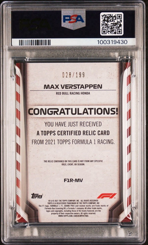 2021 Topps Formula 1 #F1RMV Max Verstappen Rookie Relics Auto /199 Psa/Dna Dual
