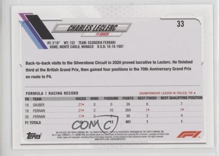 2021 Topps Formula 1 - [Base] #33 F1 Drivers - Charles Leclerc - Racing Card - Featuring the Scuderia Ferrari - Featuring Charles Leclerc Search for more: 2021 Topps Formula 1 Search for more: 2021 Topps Formula 1 - [Base] View all of our Listings Auctions Buy It Now About Us Located in the beautiful Pacific Northwest, COMC (Check Out My Cards) is the world's largest consignment service for trading card singles. More than 10,000 people have used our consignment service to list over 50 million trading cards. We currently house 20 million cards, each listed for sale with front and back images of the actual card. Find out how we can help you consign your items on eBay by contacting us through eBay messaging. COMC -- "The Safe & Easy Way to Buy & Sell" Representative Image - Select Specific Item above to see image of actual item Representative Image - Select Specific Item above to see image of actual item Raw Condition for Modern Cards Unless otherwise noted, raw modern cards are listed in Near Mint-Mint condition or better. A NM-MT card appears to be Mint at first glance, but upon closer inspection, may exhibit some of the following: minor print defects (e.g. roller marks, print line, dimple), minor scratches, slight edge wear, and slight corner wear. Centering is clearly visible in the images provided and does not factor into our condition assessment. Raw Condition for Vintage Cards Unless otherwise noted, raw vintage cards are listed in Excellent condition or better. An EX card may exhibit some of the following: minor rounding of corners, surface wear, print defects, light scratches, and slight edge wear/chipping. Centering is clearly visible in the images provided and does not factor into our condition assessment. Domestic Shipping Combined shipping for multiple items is available. To receive combined shipping, please ensure all desired items are in your eBay shopping cart before proceeding to checkout. eBay limits orders to 40 items per order. We automatically combine multiple orders placed on the same day. If you place multiple orders on the same day, please contact us to request a refund of applicable shipping costs. Signature confirmation may be required on invoices over $400. Raw cards are shipped in toploaders. International Shipping COMC offers eBay's International Shipping (EIS) for international orders under $2,500* (see country exceptions below). All duties and import fees are paid at checkout; in the rare event that there are additional import fees upon delivery, these are borne by the buyer. EIS packages route through a shipping hub in Erlanger, KY before shipping to their final destination. Please note that EIS does not allow for combined shipments. The shipping rates are determined by eBay and cannot be adjusted. *Maximum sale price exceptions: Colombia, Kuwait ($2,000); Taiwan ($1,539); Chile, Costa Rica, Guatemala, Honduras, Trinidad and Tobago ($1,000); Antigua and Barbuda, Aruba, Belize, Dominica, Grenada, Philippines, Saint Kitts and Nevis, Saint Lucia, Montserrat, Turks and Caicos Islands ($500); Dominican Republic, El Salvador ($200). Please request a shipping quote through eBay messaging for orders that exceed the maximum sale price supported by eBay's International Shipping. You will be responsible for all duties and import fees for international orders shipped outside the EIS. Raw cards are shipped in toploaders. Payment COMC does not accept offers on our cards through our eBay storefront. COMC utilizes eBay’s managed payments system. If you are experiencing difficulties making a payment, please contact eBay for assistance. Return Policy Returns are only accepted on the rare occasion the item is not as described. If you are making a return, please initiate the return process through eBay so a mailing label can be provided for you. Prior to listing, our expert team carefully assessed this item to represent it accurately. Please review the description and high-definition images prior to purchasing to ensure this item meets your satisfaction. We welcome you to contact us if you have further questions about this item. Trust and Integrity COMC carefully assesses each item consigned to us to prevent fraudulent items from entering the marketplace. If you believe an item offered on COMC may be fraudulent, please contact us with details so we can investigate the issue. Items we determine are outside our supported items policy may be removed. Last Modified: 12/14/2024 2:58:40 PM PDT