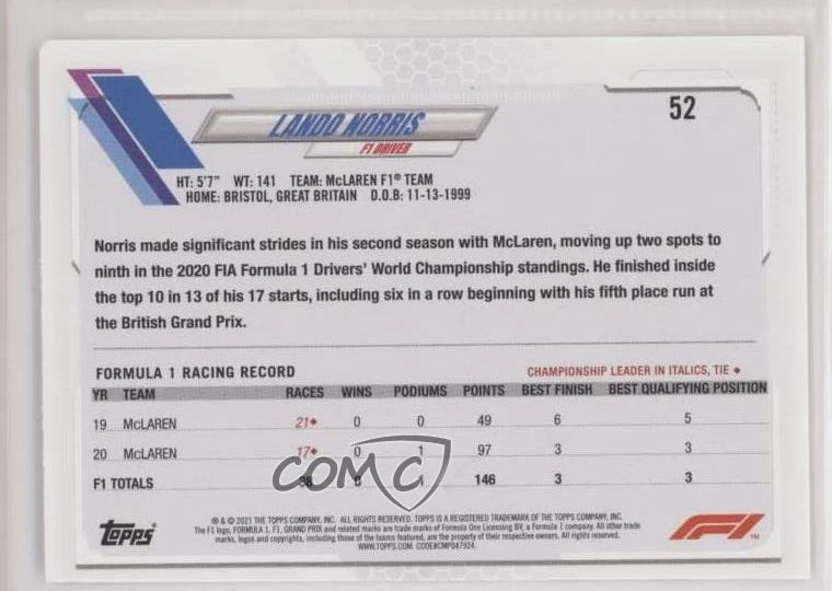2021 Topps Formula 1 - [Base] #52 F1 Drivers - Lando Norris - Racing Card - Featuring the McLaren Formula 1 Team - Featuring Lando Norris Search for more: 2021 Topps Formula 1 Search for more: 2021 Topps Formula 1 - [Base] View all of our Listings Auctions Buy It Now About Us Located in the beautiful Pacific Northwest, COMC (Check Out My Cards) is the world's largest consignment service for trading card singles. More than 10,000 people have used our consignment service to list over 50 million trading cards. We currently house 20 million cards, each listed for sale with front and back images of the actual card. Find out how we can help you consign your items on eBay by contacting us through eBay messaging. COMC -- "The Safe & Easy Way to Buy & Sell" Representative Image - Select Specific Item above to see image of actual item Representative Image - Select Specific Item above to see image of actual item Raw Condition for Modern Cards Unless otherwise noted, raw modern cards are listed in Near Mint-Mint condition or better. A NM-MT card appears to be Mint at first glance, but upon closer inspection, may exhibit some of the following: minor print defects (e.g. roller marks, print line, dimple), minor scratches, slight edge wear, and slight corner wear. Centering is clearly visible in the images provided and does not factor into our condition assessment. Raw Condition for Vintage Cards Unless otherwise noted, raw vintage cards are listed in Excellent condition or better. An EX card may exhibit some of the following: minor rounding of corners, surface wear, print defects, light scratches, and slight edge wear/chipping. Centering is clearly visible in the images provided and does not factor into our condition assessment. Domestic Shipping Combined shipping for multiple items is available. To receive combined shipping, please ensure all desired items are in your eBay shopping cart before proceeding to checkout. eBay limits orders to 40 items per order. We automatically combine multiple orders placed on the same day. If you place multiple orders on the same day, please contact us to request a refund of applicable shipping costs. Signature confirmation may be required on invoices over $400. Raw cards are shipped in toploaders. International Shipping COMC offers eBay's International Shipping (EIS) for international orders under $2,500* (see country exceptions below). All duties and import fees are paid at checkout; in the rare event that there are additional import fees upon delivery, these are borne by the buyer. EIS packages route through a shipping hub in Erlanger, KY before shipping to their final destination. Please note that EIS does not allow for combined shipments. The shipping rates are determined by eBay and cannot be adjusted. *Maximum sale price exceptions: Colombia, Kuwait ($2,000); Taiwan ($1,539); Chile, Costa Rica, Guatemala, Honduras, Trinidad and Tobago ($1,000); Antigua and Barbuda, Aruba, Belize, Dominica, Grenada, Philippines, Saint Kitts and Nevis, Saint Lucia, Montserrat, Turks and Caicos Islands ($500); Dominican Republic, El Salvador ($200). Please request a shipping quote through eBay messaging for orders that exceed the maximum sale price supported by eBay's International Shipping. You will be responsible for all duties and import fees for international orders shipped outside the EIS. Raw cards are shipped in toploaders. Payment COMC does not accept offers on our cards through our eBay storefront. COMC utilizes eBay’s managed payments system. If you are experiencing difficulties making a payment, please contact eBay for assistance. Return Policy Returns are only accepted on the rare occasion the item is not as described. If you are making a return, please initiate the return process through eBay so a mailing label can be provided for you. Prior to listing, our expert team carefully assessed this item to represent it accurately. Please review the description and high-definition images prior to purchasing to ensure this item meets your satisfaction. We welcome you to contact us if you have further questions about this item. Trust and Integrity COMC carefully assesses each item consigned to us to prevent fraudulent items from entering the marketplace. If you believe an item offered on COMC may be fraudulent, please contact us with details so we can investigate the issue. Items we determine are outside our supported items policy may be removed. Last Modified: 11/30/2024 11:02:49 PM PDT