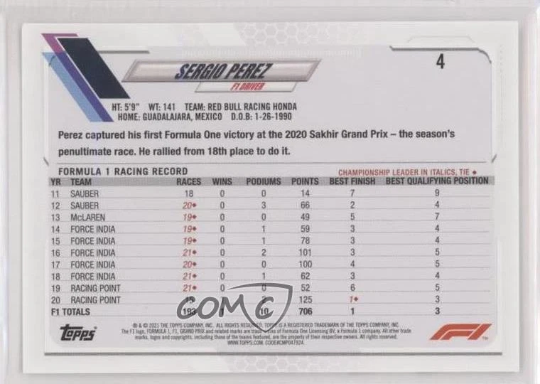 2021 Topps Formula 1 - [Base] #4.1 F1 Drivers - Sergio Perez - Racing Card - Featuring the Red Bull Racing - Featuring Sergio Perez Search for more: 2021 Topps Formula 1 Search for more: 2021 Topps Formula 1 - [Base] View all of our Listings Auctions Buy It Now About Us Located in the beautiful Pacific Northwest, COMC (Check Out My Cards) is the world's largest consignment service for trading card singles. More than 10,000 people have used our consignment service to list over 50 million trading cards. We currently house 20 million cards, each listed for sale with front and back images of the actual card. Find out how we can help you consign your items on eBay by contacting us through eBay messaging. COMC -- "The Safe & Easy Way to Buy & Sell" Representative Image - Select Specific Item above to see image of actual item Representative Image - Select Specific Item above to see image of actual item Raw Condition for Modern Cards Unless otherwise noted, raw modern cards are listed in Near Mint-Mint condition or better. A NM-MT card appears to be Mint at first glance, but upon closer inspection, may exhibit some of the following: minor print defects (e.g. roller marks, print line, dimple), minor scratches, slight edge wear, and slight corner wear. Centering is clearly visible in the images provided and does not factor into our condition assessment. Raw Condition for Vintage Cards Unless otherwise noted, raw vintage cards are listed in Excellent condition or better. An EX card may exhibit some of the following: minor rounding of corners, surface wear, print defects, light scratches, and slight edge wear/chipping. Centering is clearly visible in the images provided and does not factor into our condition assessment. Domestic Shipping Combined shipping for multiple items is available. To receive combined shipping, please ensure all desired items are in your eBay shopping cart before proceeding to checkout. eBay limits orders to 40 items per order. We automatically combine multiple orders placed on the same day. If you place multiple orders on the same day, please contact us to request a refund of applicable shipping costs. Signature confirmation may be required on invoices over $400. Raw cards are shipped in toploaders. International Shipping COMC offers eBay's International Shipping (EIS) for international orders under $2,500* (see country exceptions below). All duties and import fees are paid at checkout; in the rare event that there are additional import fees upon delivery, these are borne by the buyer. EIS packages route through a shipping hub in Erlanger, KY before shipping to their final destination. Please note that EIS does not allow for combined shipments. The shipping rates are determined by eBay and cannot be adjusted. *Maximum sale price exceptions: Colombia, Kuwait ($2,000); Taiwan ($1,539); Chile, Costa Rica, Guatemala, Honduras, Trinidad and Tobago ($1,000); Antigua and Barbuda, Aruba, Belize, Dominica, Grenada, Philippines, Saint Kitts and Nevis, Saint Lucia, Montserrat, Turks and Caicos Islands ($500); Dominican Republic, El Salvador ($200). Please request a shipping quote through eBay messaging for orders that exceed the maximum sale price supported by eBay's International Shipping. You will be responsible for all duties and import fees for international orders shipped outside the EIS. Raw cards are shipped in toploaders. Payment COMC does not accept offers on our cards through our eBay storefront. COMC utilizes eBay’s managed payments system. If you are experiencing difficulties making a payment, please contact eBay for assistance. Return Policy Returns are only accepted on the rare occasion the item is not as described. If you are making a return, please initiate the return process through eBay so a mailing label can be provided for you. Prior to listing, our expert team carefully assessed this item to represent it accurately. Please review the description and high-definition images prior to purchasing to ensure this item meets your satisfaction. We welcome you to contact us if you have further questions about this item. Trust and Integrity COMC carefully assesses each item consigned to us to prevent fraudulent items from entering the marketplace. If you believe an item offered on COMC may be fraudulent, please contact us with details so we can investigate the issue. Items we determine are outside our supported items policy may be removed. Last Modified: 11/30/2024 11:01:28 PM PDT