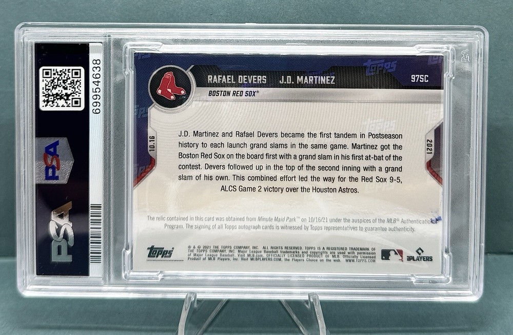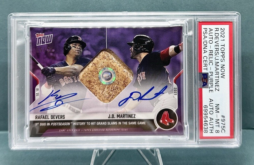 Own a Piece of Red Sox History Introducing the 2021 Topps Now Dual Autograph Relic Card, featuring Rafael Devers and J.D. Martinez—two of the Boston Red Sox’s biggest stars. This exceptional card isn’t just a collectible; it’s a true piece of the game. Showcasing hard-signed autographs from both Devers and Martinez, this card also features an authentic game-used base relic, connecting you directly to the action on the field. With an ultra-limited print run of just 25, it’s a rare find for any serious collector. Key highlights include: - Dual On-Card Autographs (Hard Signed) - Authentic Game-Used Base Relic - Serial-Numbered /25 - Embossed for authenticity and premium detail - PSA Certified Autograph Authentication Crafted by Topps Now, this card captures a moment in Red Sox history, blending elite player signatures with game-used memorabilia. Don’t miss the chance to own a truly rare, authenticated collectible that celebrates two of Boston’s finest.