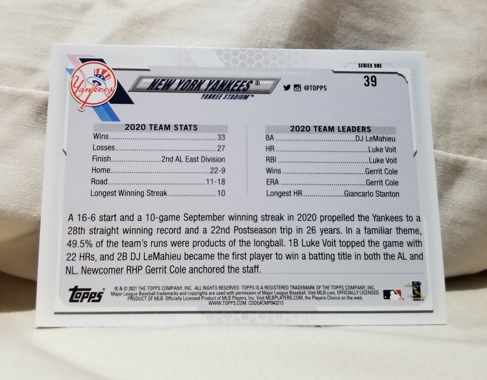 Team:New York YankeesSeries:Toppsbrand:ToppsSeason:2021Sport:BaseballAdditional Description:New York YankeesLeague:Major League Baseball (MLB)Set:2021 ToppsCard Number:39Manufacturer:ToppsFeatures:Base Set, Parallel/VarietyParallel/Variety:Rainbow Foil